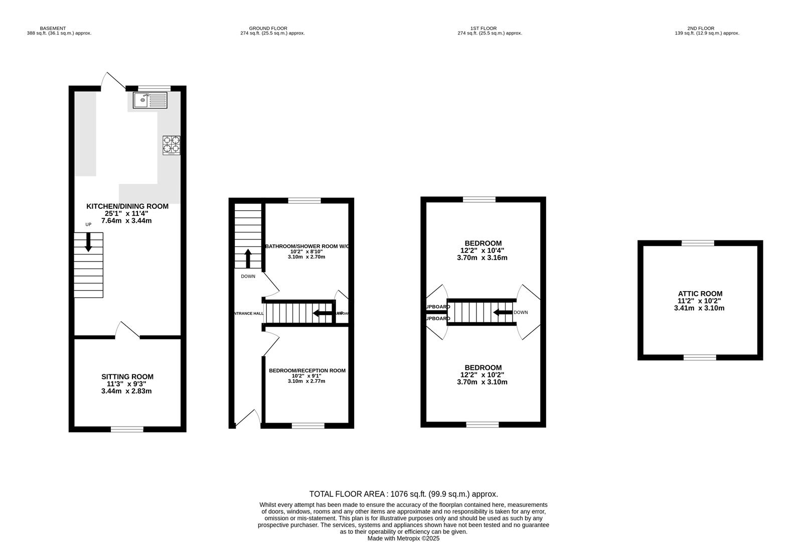 The accommodation comprises of Entrance Hall, bedroom three/reception room and bathroom with separate shower W/C. To the lower ground floor there is a spacious kitchen/dining room with integrated appliances, and a further reception room. To the top floor there are two further double bedrooms and a useable bonus attic room.