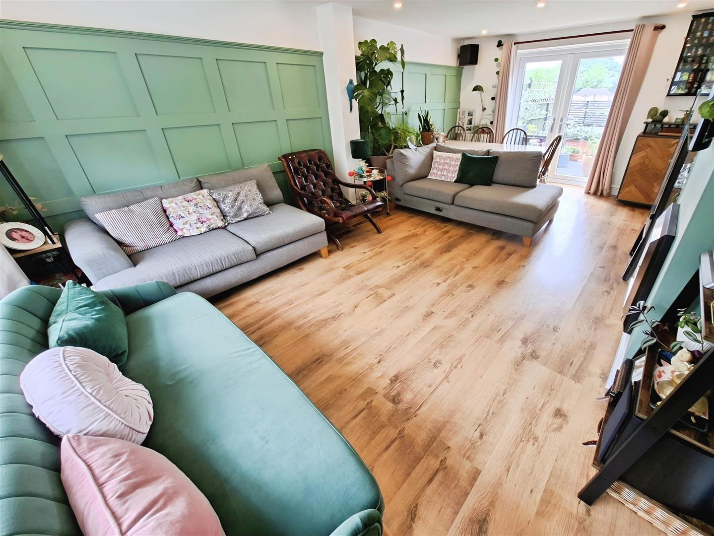 Another great size spacious and light room with bay window to front, patio doors to rear, plenty of space for sofas, furniture and dining table and chairs, laminate flooring continued with panelled walls, feature gas fireplace and downlighters.