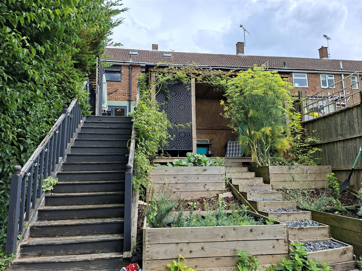 Exceptionally spacious and beautifully established garden for any size family, with large decked area and space for hot-tub (possibly to stay) and tables and chairs for outdoor dining, a few steps down to covered sitting area, raised vegetable planters, attractive lawn garden with range of plants, shrubs and flowers, leading down to a further decked area with summerhouse.