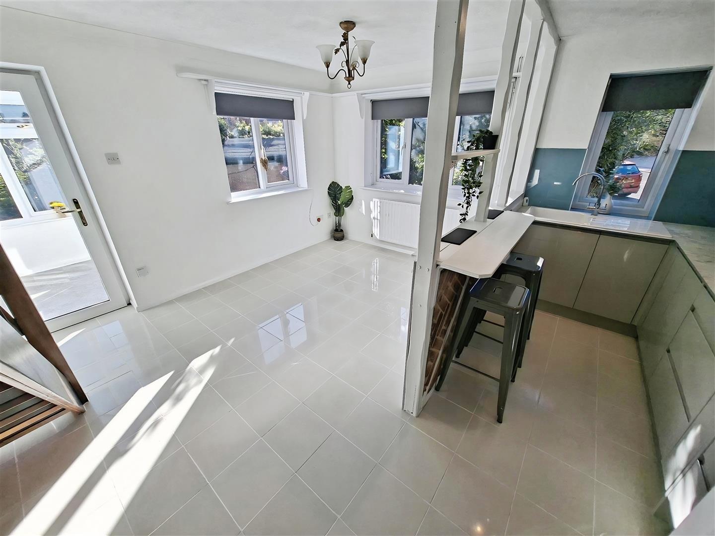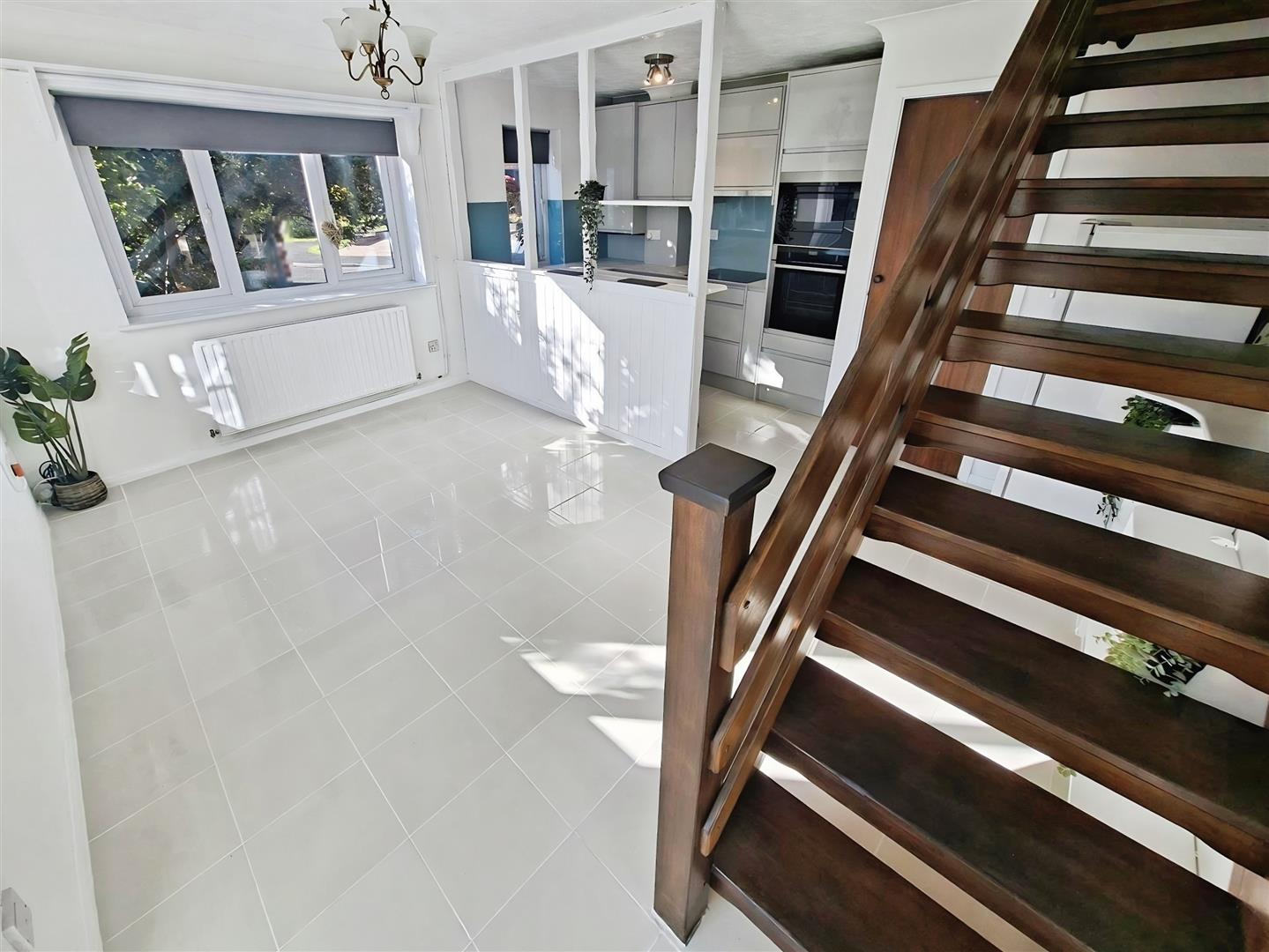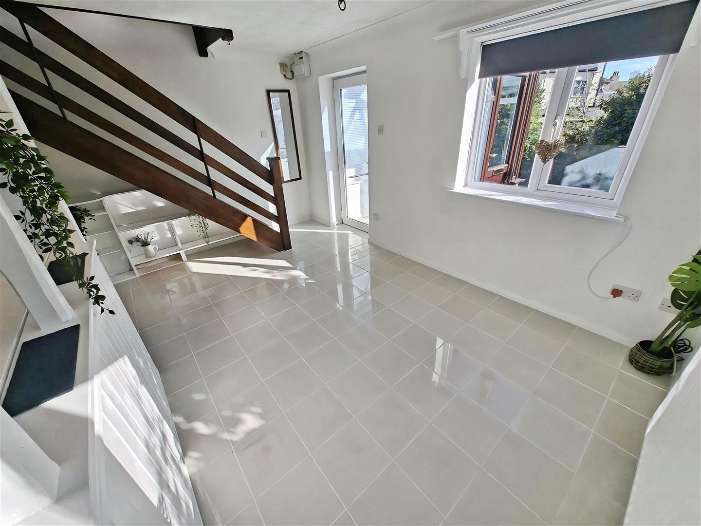 Spacious room with windows front and side with fitted blinds, attractive neutral floor tiles and white walls (all newly refreshed), open-plan to kitchen but separated by feature breakfast bar. Recently re-varnished wooden stairs with built-in storage shelves and space for fridge-freezer underneath lead up to the bedroom and bathroom.