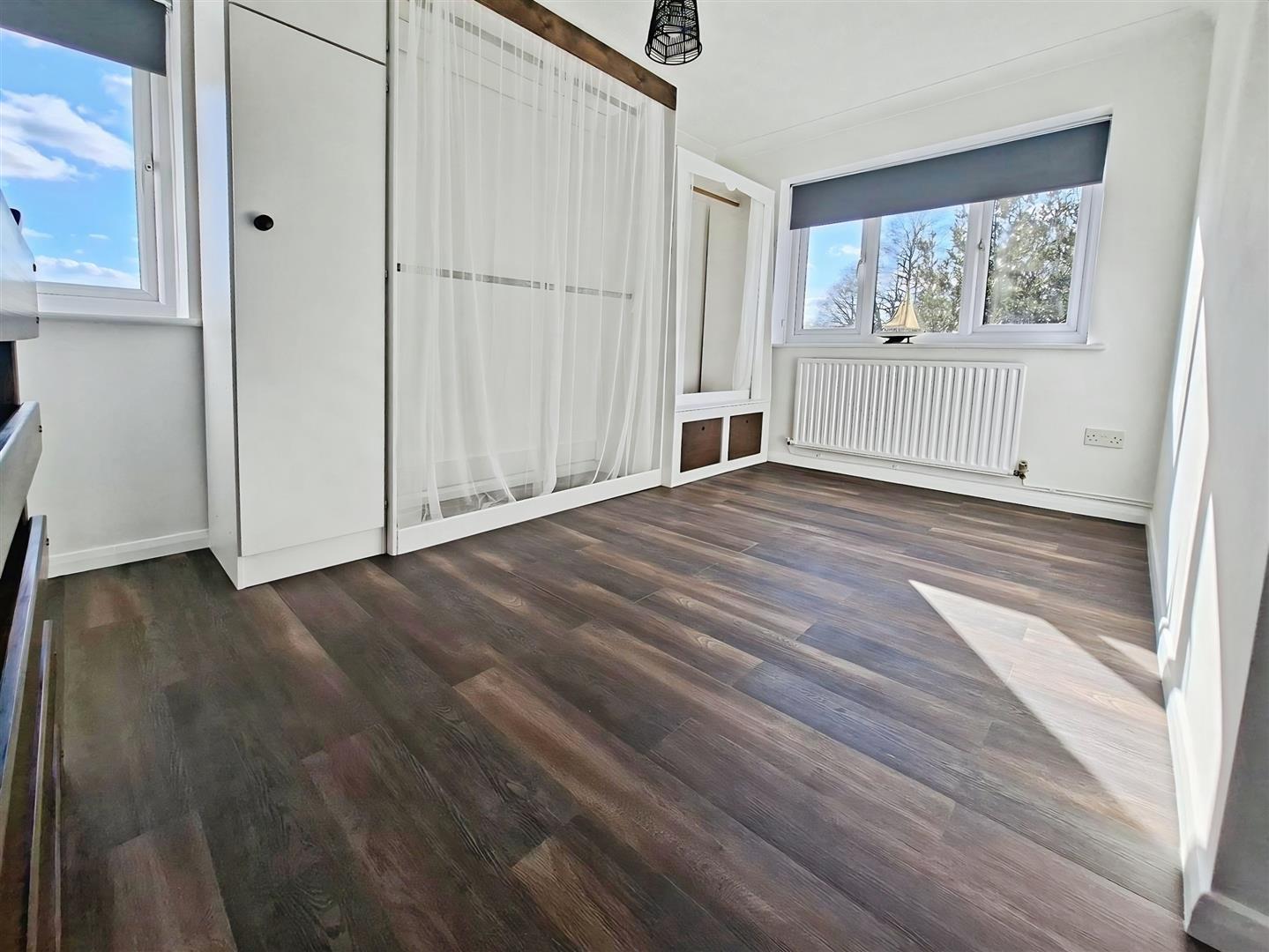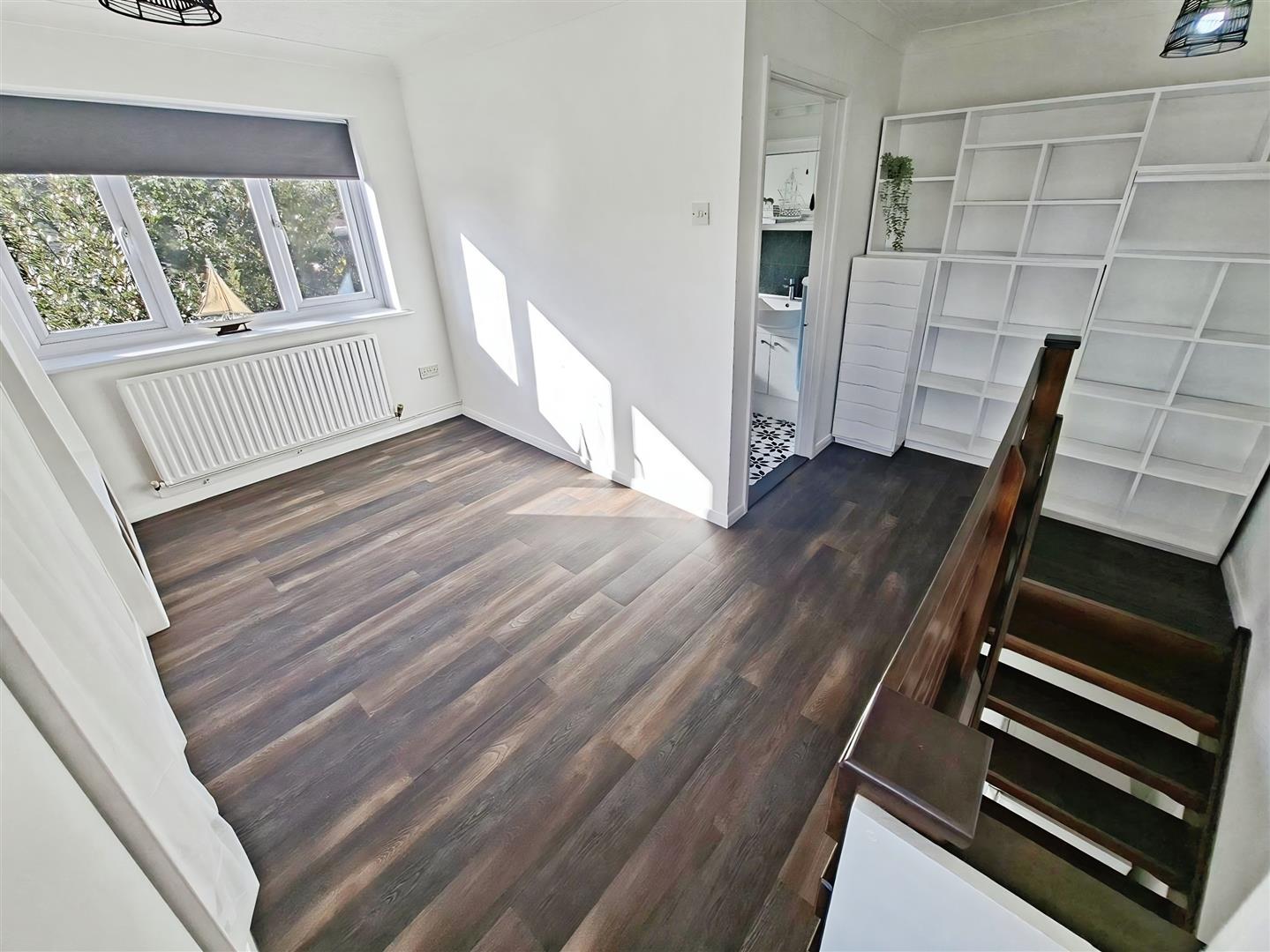 Spacious double bedroom with new wood-effect laminate flooring and white walls, window to side with partial river views, further window to front of property, built-in wardrobes and cupboards, further extensive storage options on open-plan landing area.