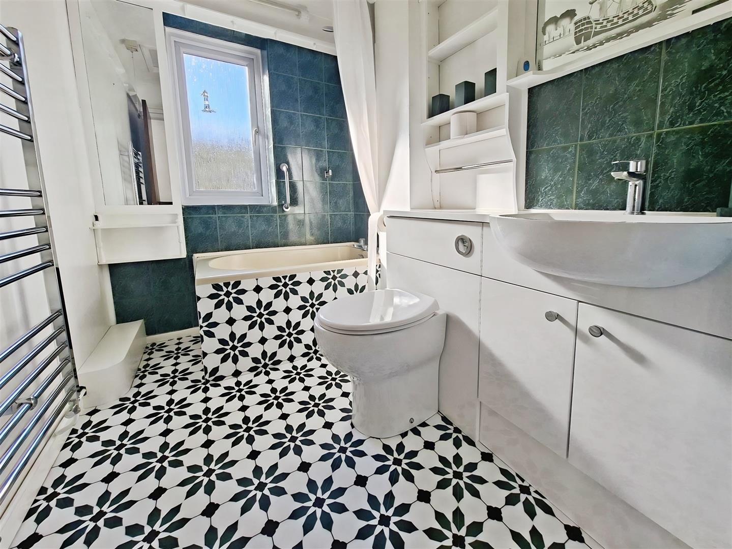 Spacious and bright room with bathroom suite consisting of half-bath with electric shower over, WC and basin built-in to vanity cupboard with worktop, colourful splashback tiles and neutral decor, with new feature vinyl flooring. Window to front of property, and access to the good size boarded loft area.