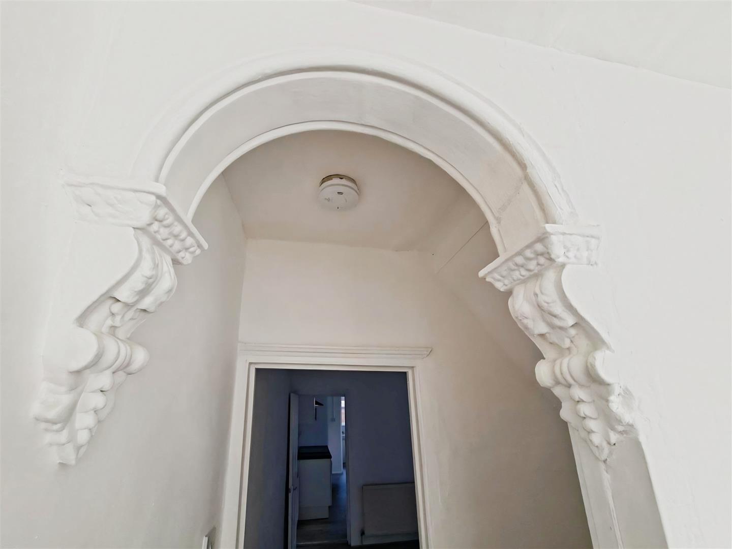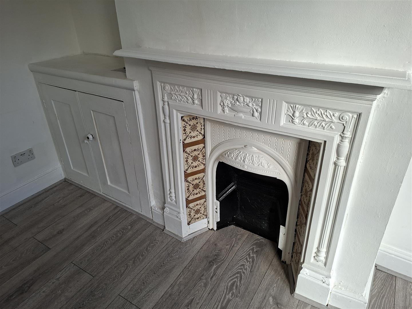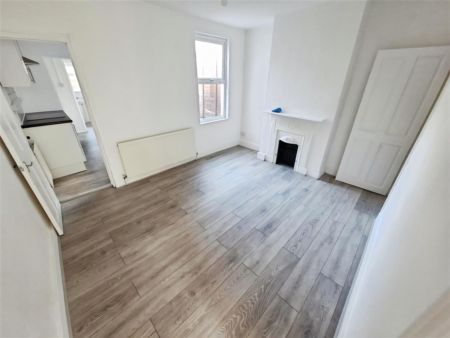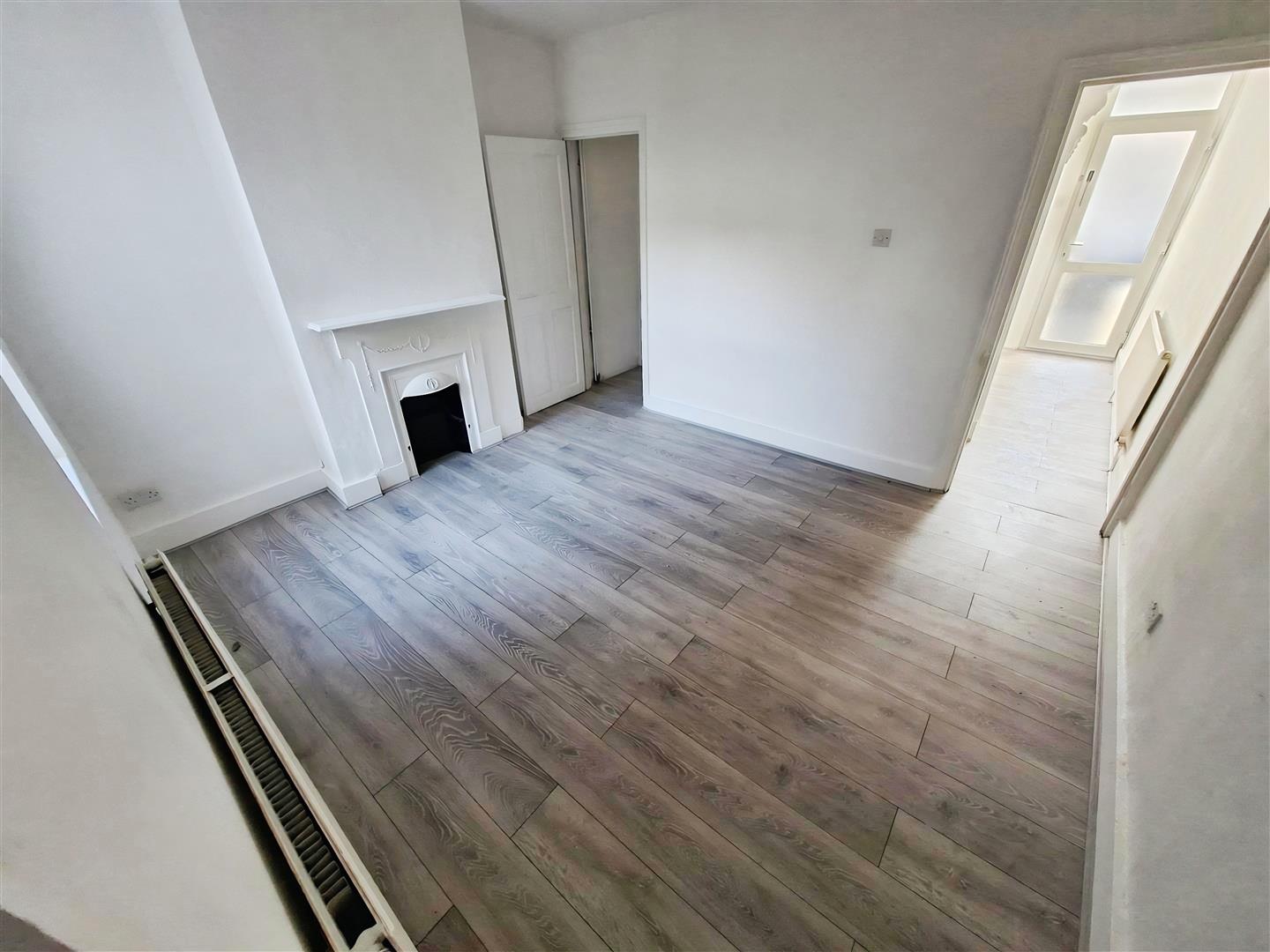 Spacious and light room with grey "wood-effect" laminate flooring and white walls continuing throughout the ground floor, original feature fireplace and surround with useful storage cupboard to side, bay window to front, original archway leading to large cloakroom/storage area and through to dining room.
