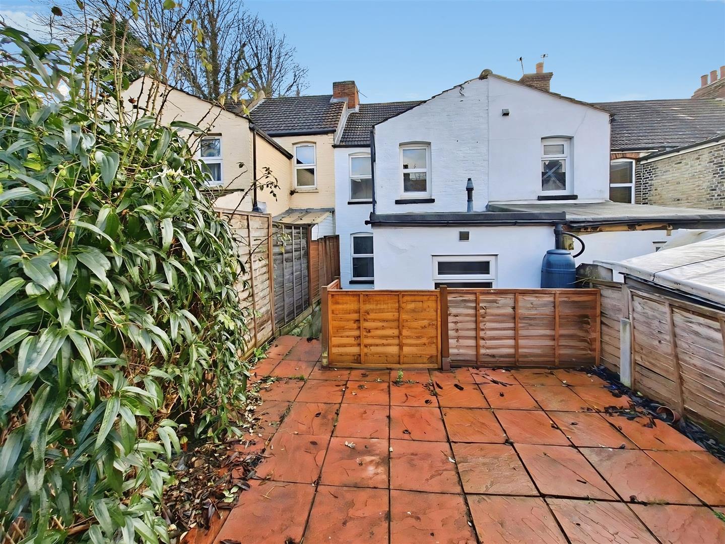 Low maintenance paved rear garden with further hard-standing area to side/rear of house, raised planters, established plants and shrubs, lovely private space.