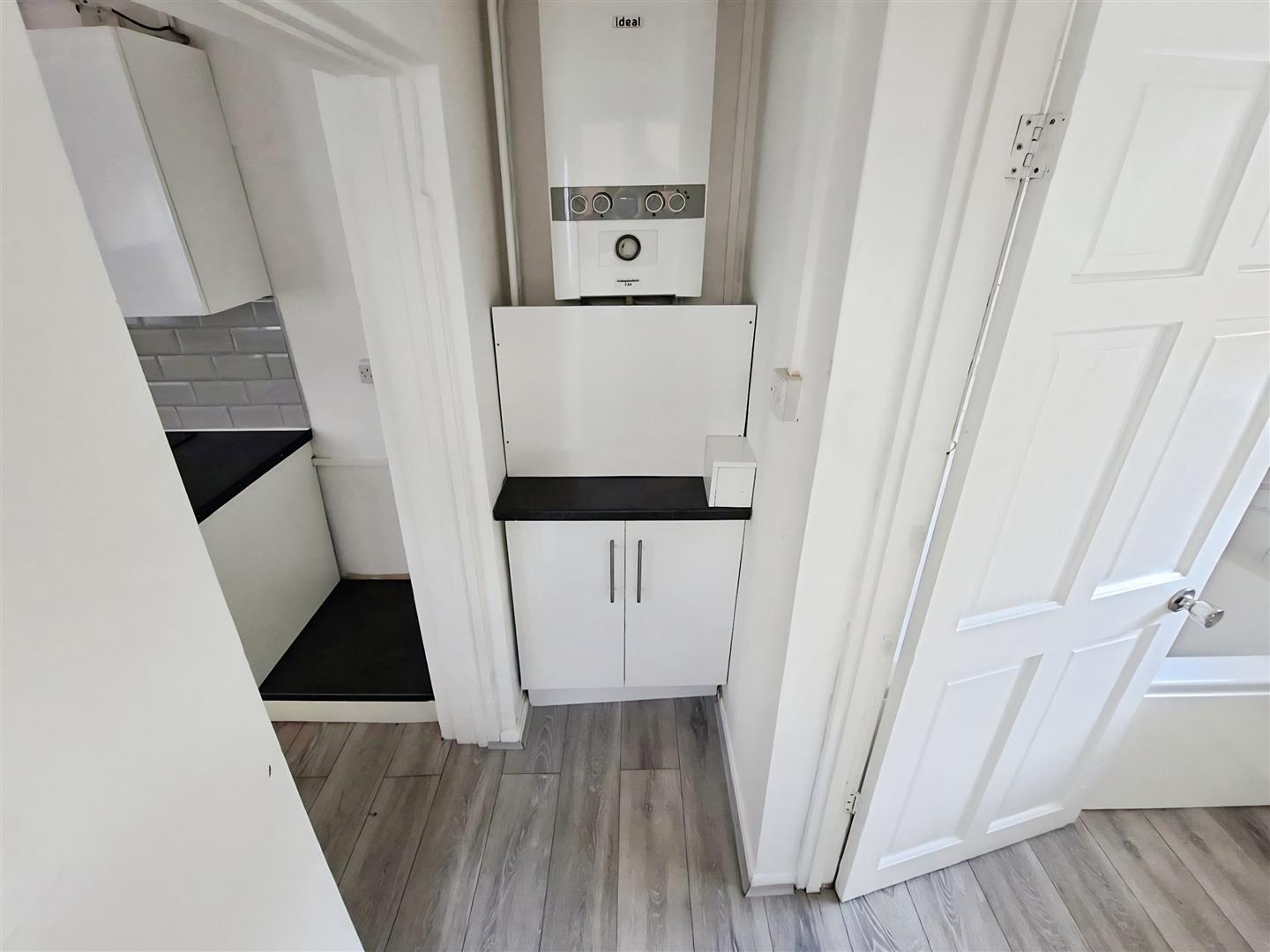 Useful extra space with storage cupboard and boiler, door out to garden doorway into bathroom.