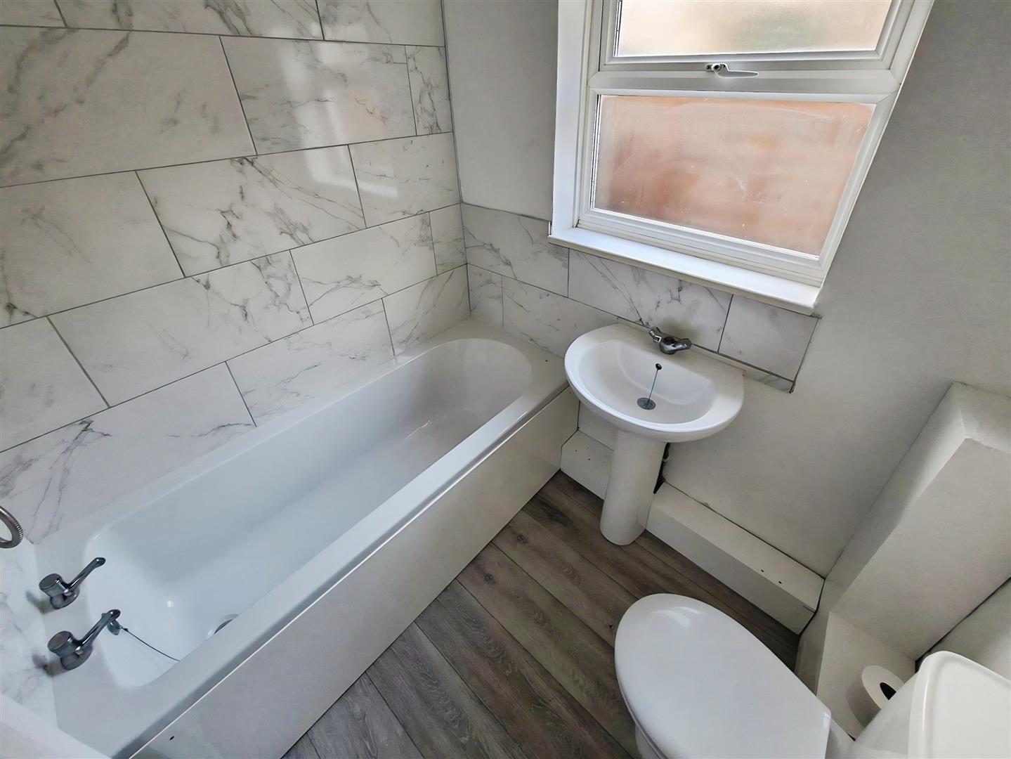 With white suite consisting of bath with shower over, basin and WC, window to rear, attractive grey and white porcelain wall tiles, grey laminate flooring continued, and white wall radiator.