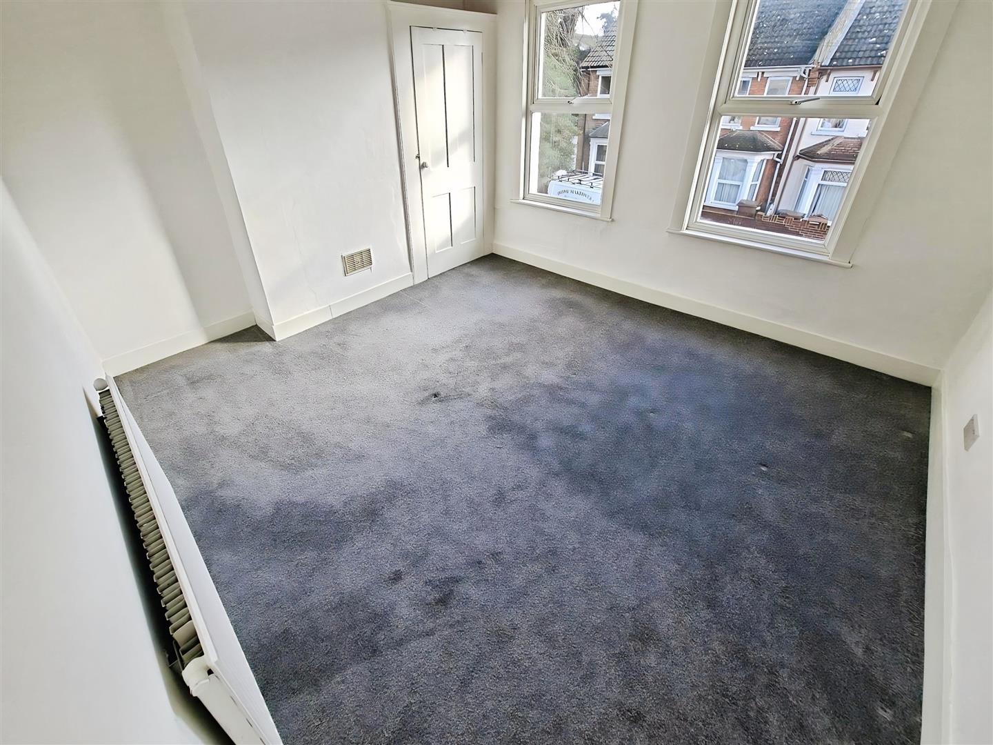 Great size double bedroom with built-in cupboard, two windows to front of house, grey carpet and white walls.