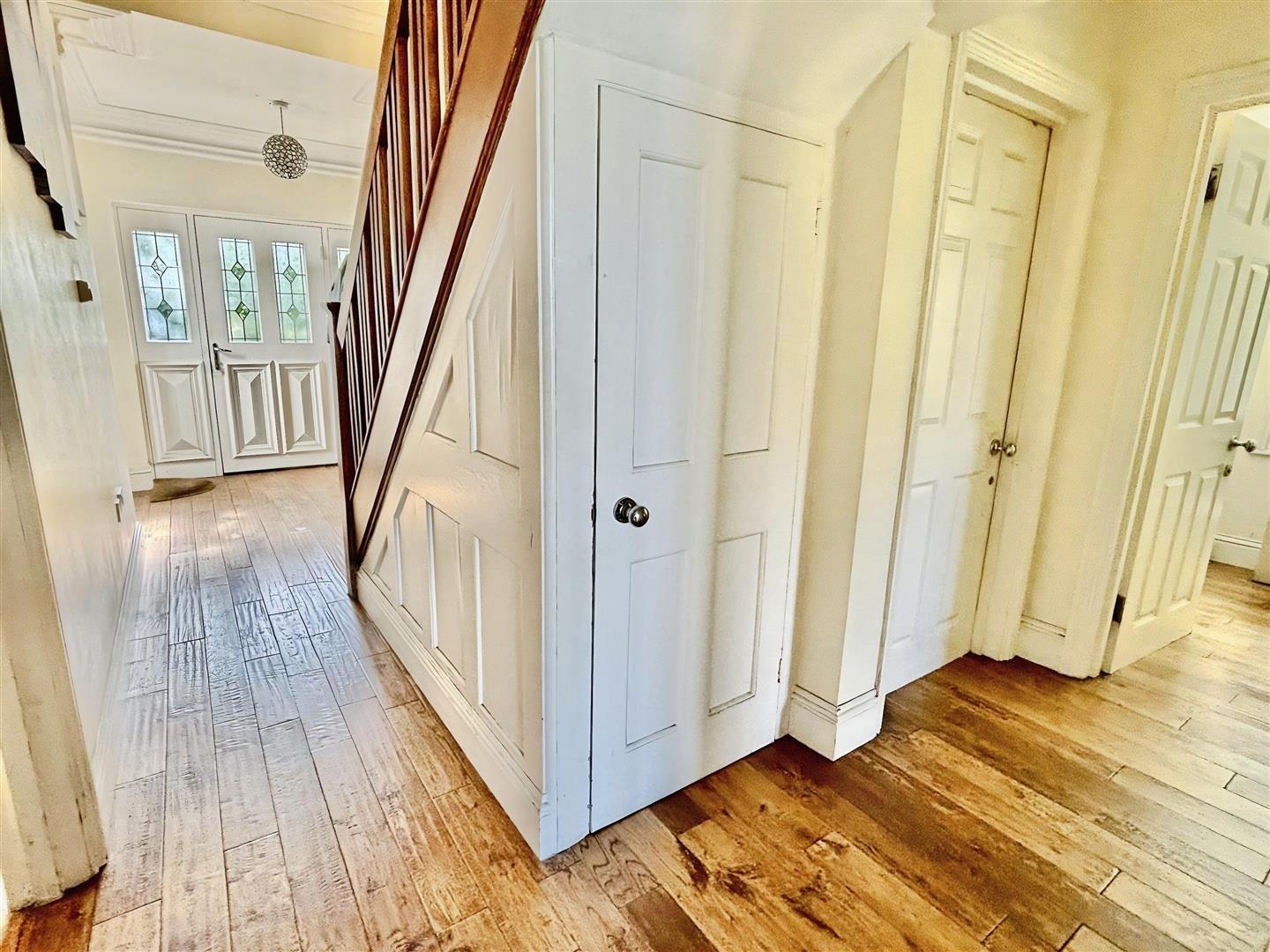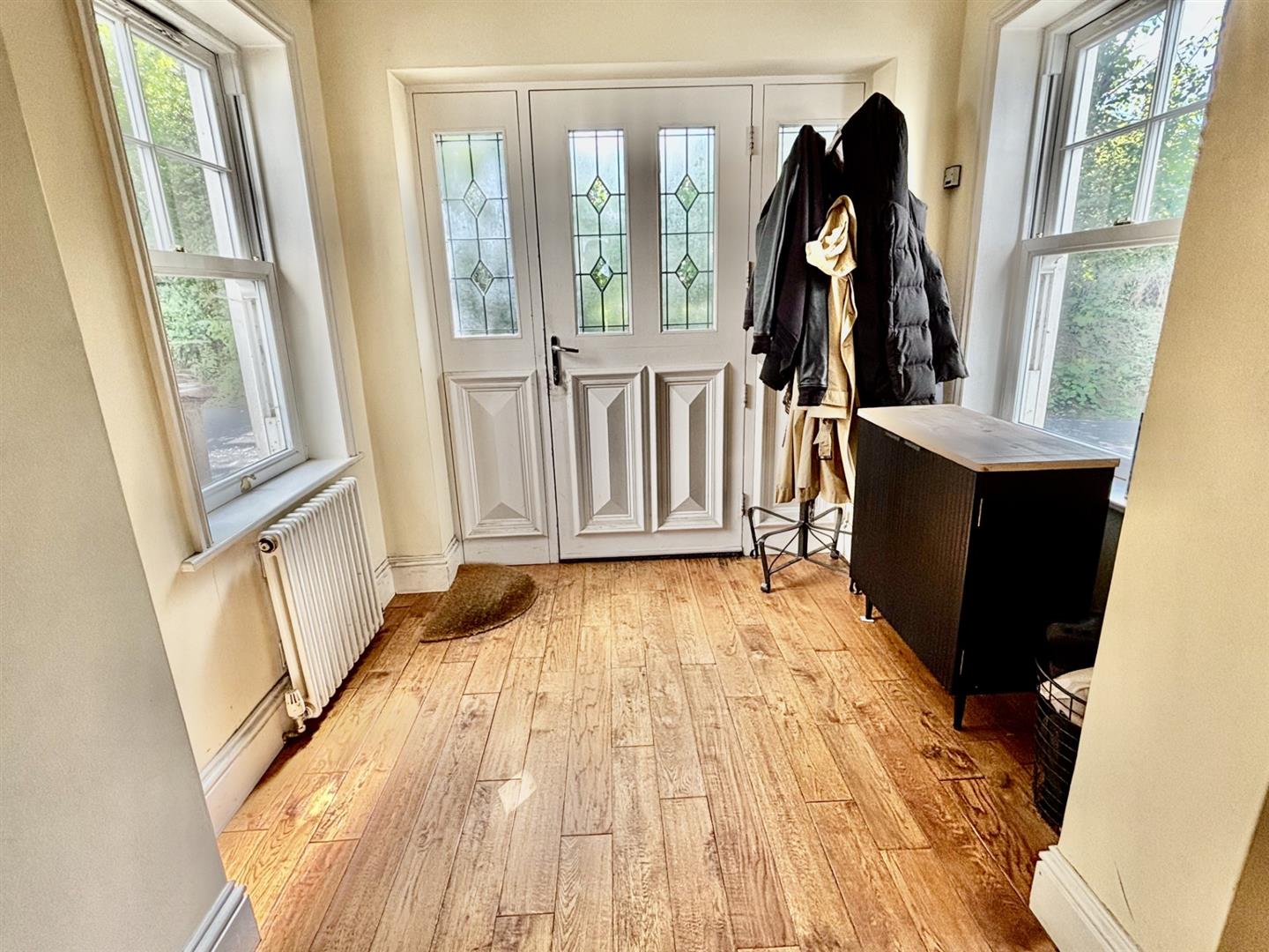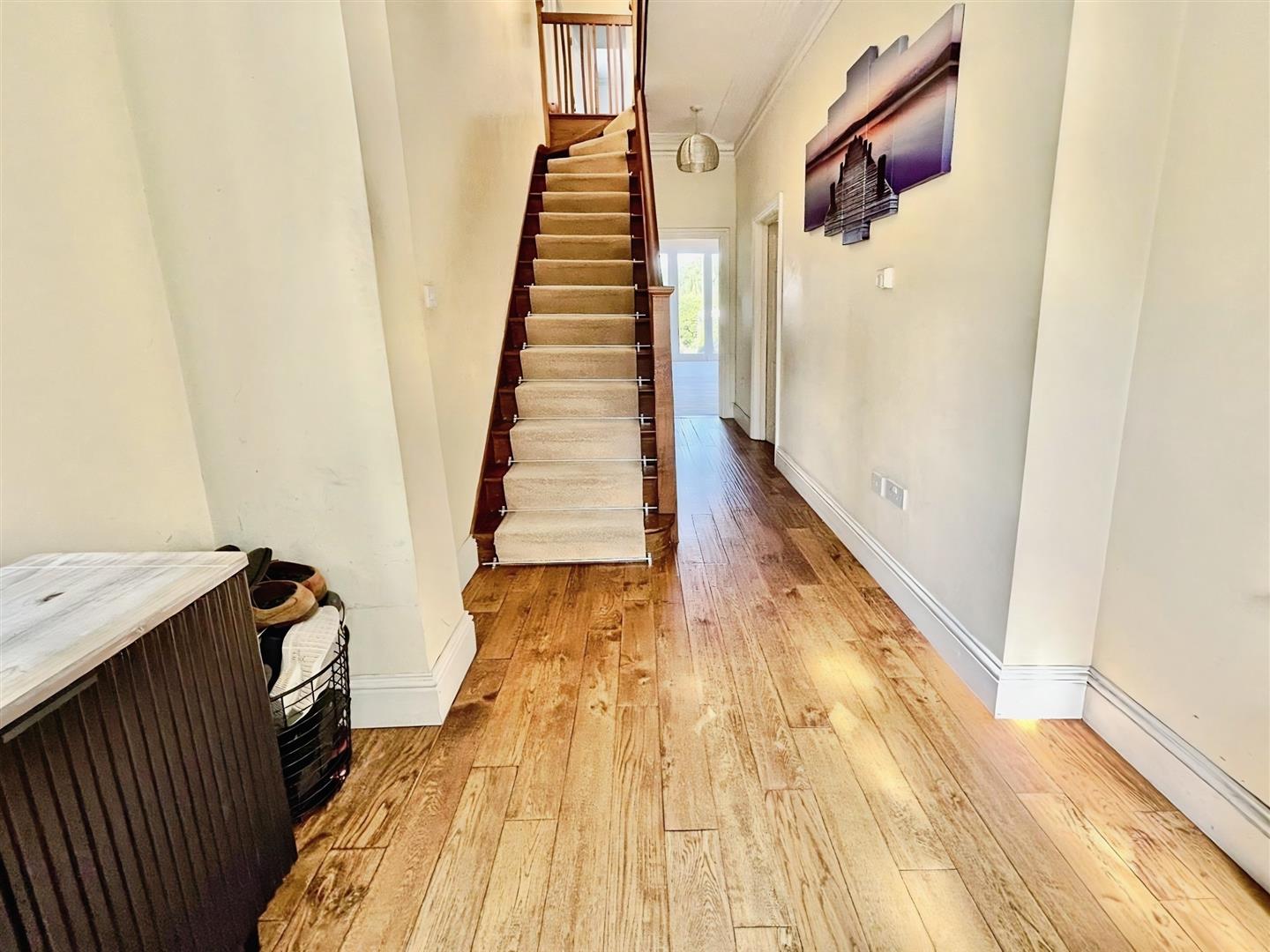An impressive storm porch complete with feature columns and tiled flooring gives access into the spacious and light hallway, with two windows either side, high ceilings with detailed cornicing, wood flooring, stairs up to first floor with under-stairs cupboard, and access to all rooms to the ground floor.