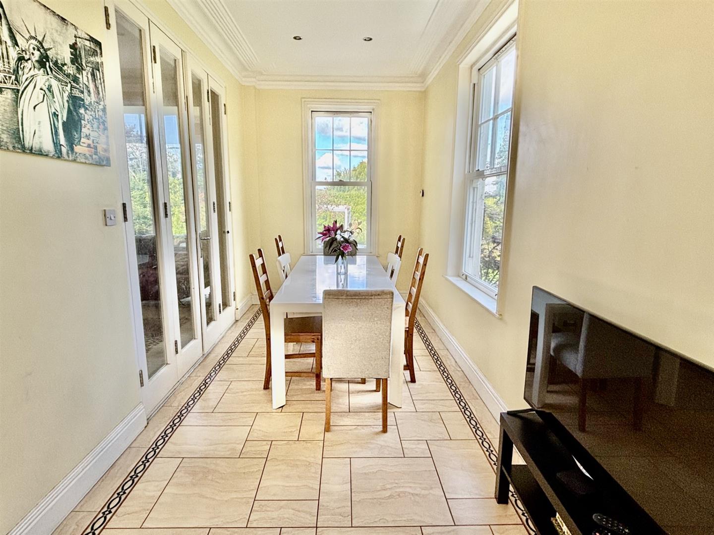 Good size space with plenty of room for table and chairs, running to side of lounge with double glass-paned bi-fold doors to lounge, high ceilings, downlighters and window to side.