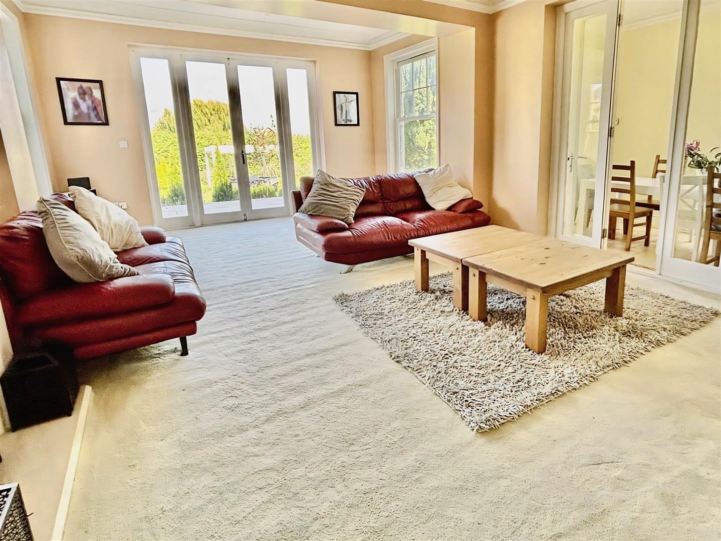 Great size lounge with double doors out to patio and garden, two large DG sash windows to rear-side of house, double bi-fold doors into dining room, with neutral carpet and decor, cornicing, feature gas fireplace and surround (untested), lovely outlook to gardens and grounds to rear.
