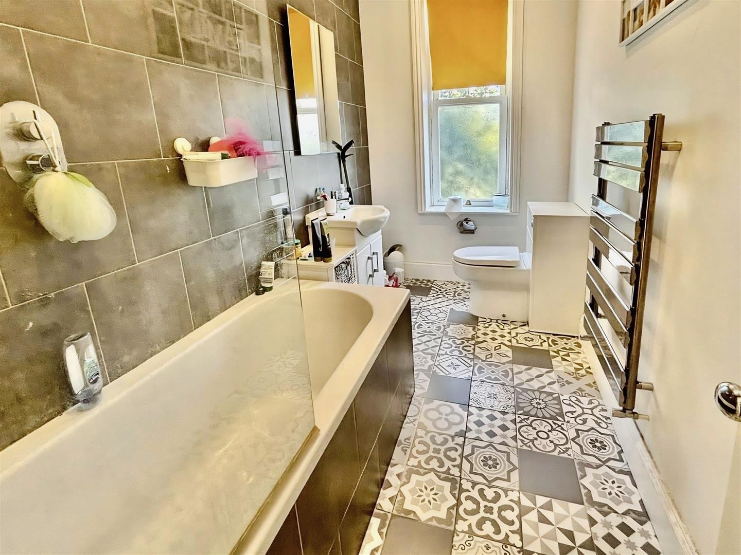 Spacious family bathroom with white suite consisting of bath, WC, basin/vanity, downlighters, feature floor tiles and grey wall tiles, vertical chrome radiator, window to side of property.
