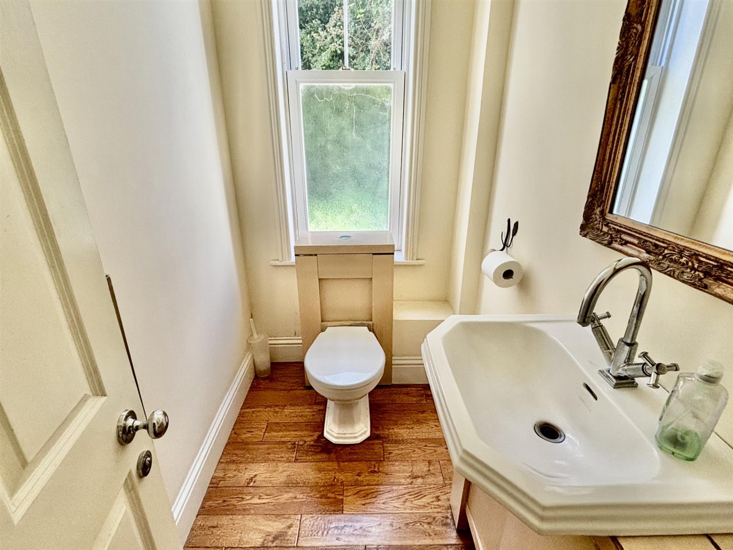 Spacious downstairs WC with high ceiling, WC and basin/vanity, sash window to side, downlighters, wood floor and neutral decor.