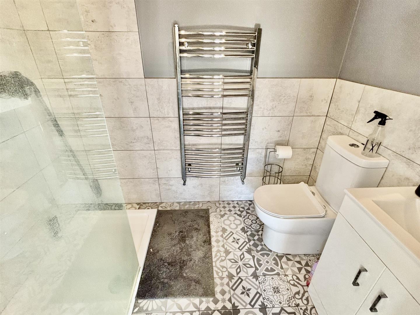 With white suite comprising of shower, WC and basin/vanity, tasteful grey wall tiles with contrasting feature floor tiles, downlighters and vertical chrome radiator.