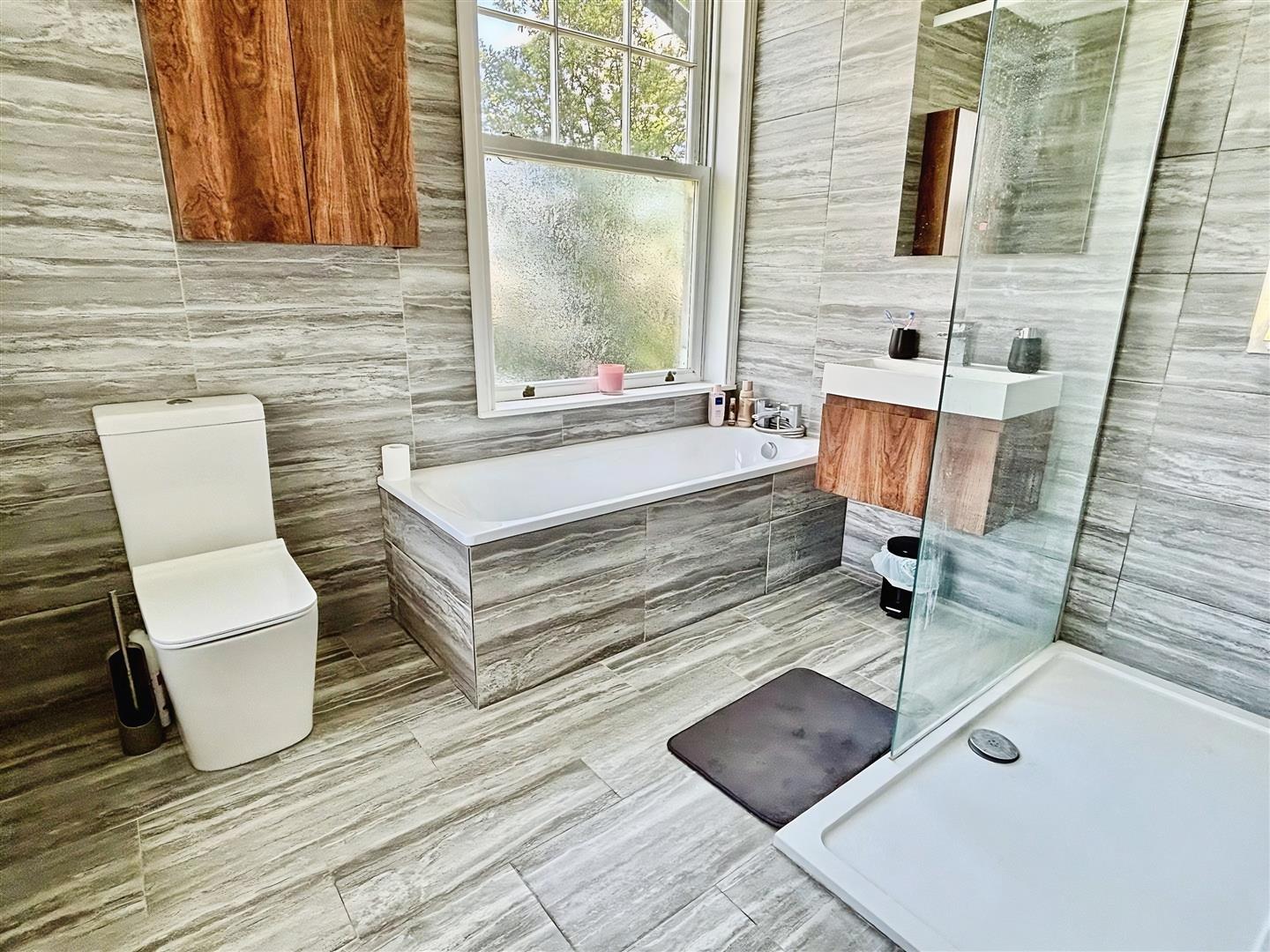 With modern grey wall and floor tiles, white site comprising of bath, separate large shower, feature basin/vanity and WC, vertical chrome radiator, high ceiling, windows to rear and side, and downlighters.