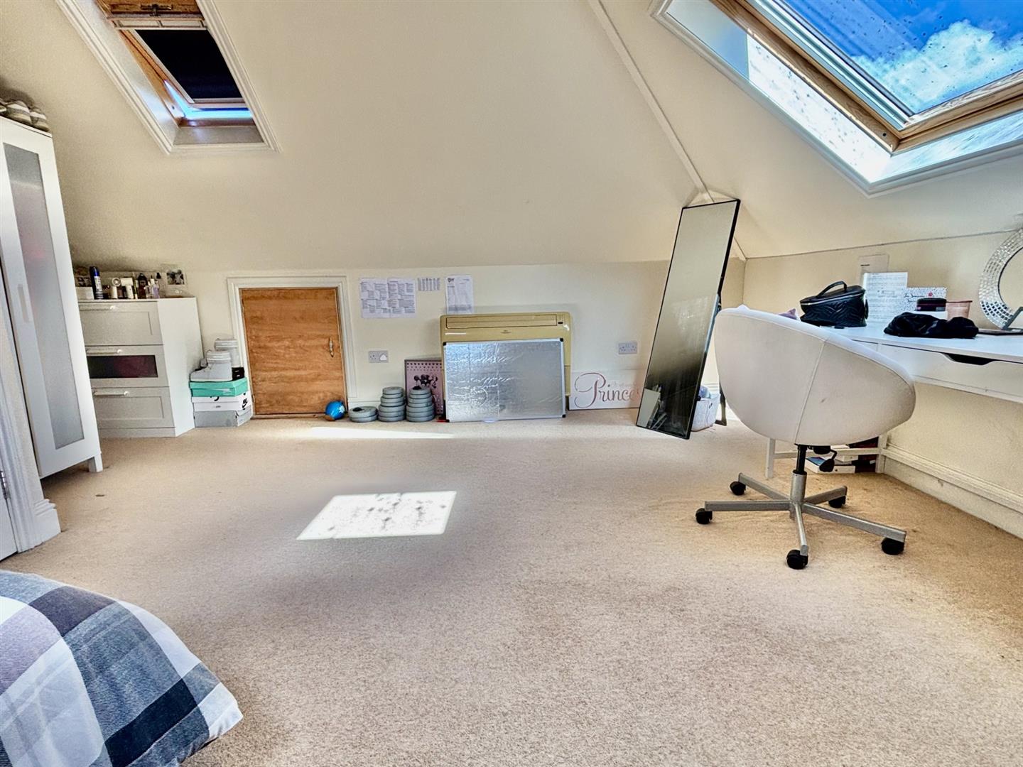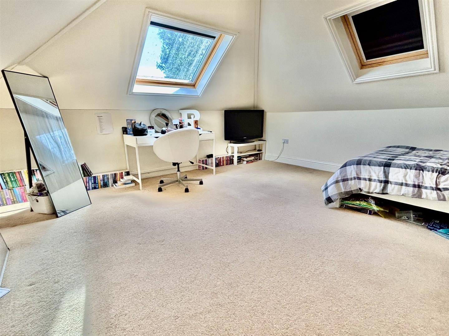 Large "loft" bedroom with three Velux windows (front, side and rear) with fitted blinds providing lots of natural light, neutral carpet and decor, large storage area with further built-in cupboard housing Mega Flow water tank, and strong potential for the addition of a further en suite, subject to new owners wishes and usual permissions.