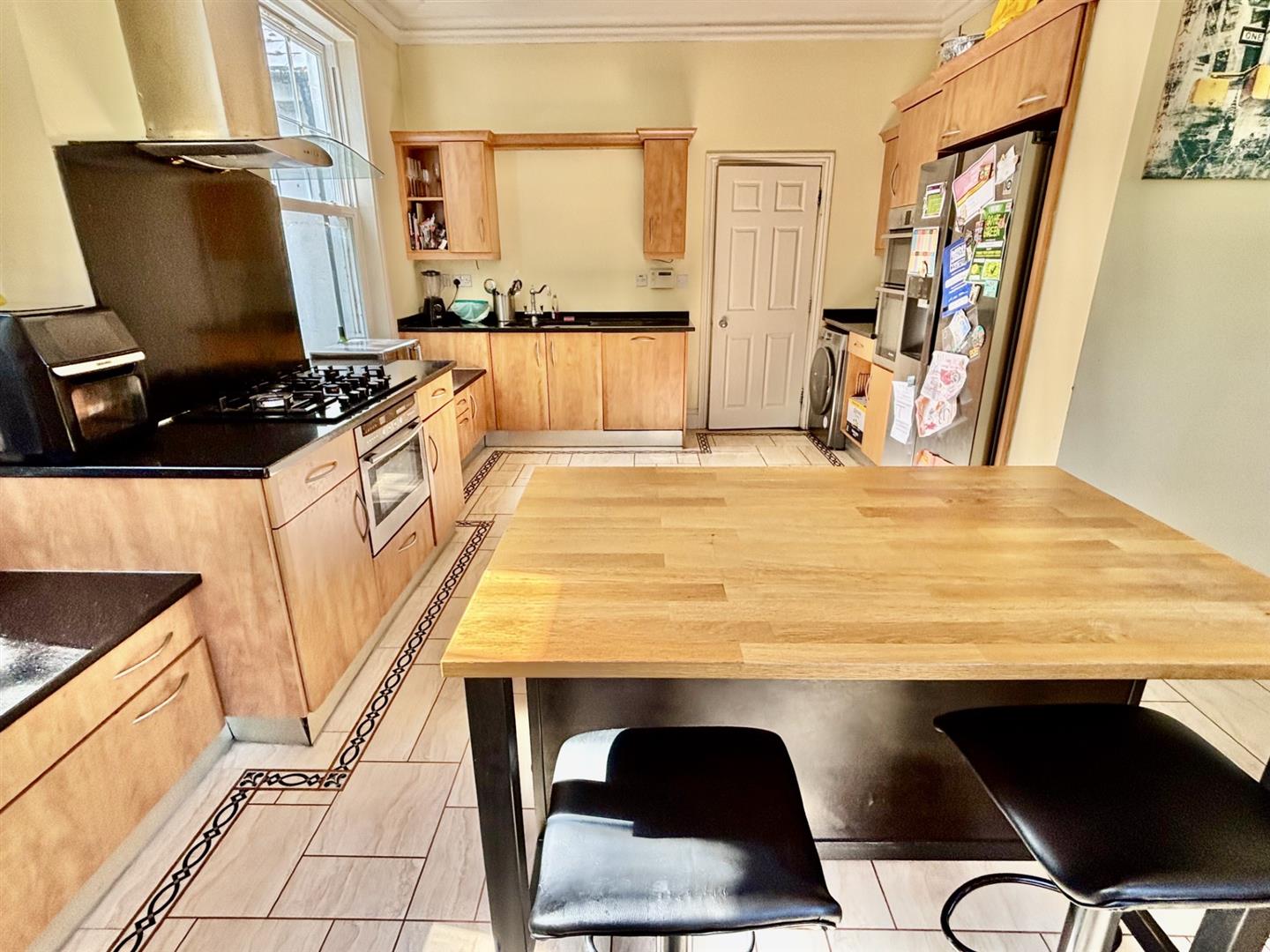 Large "L-shaped" room incorporating an open-plan kitchen and dining room, with extensive stylish wood cupboards to wall and floor with contrasting striking granite worktops, underfloor heating, double oven, gas hob, integrated fridge-freezer, downlighters, double-doors out to patio and garden, windows to front and side, high ceilings, open-plan to dining area.