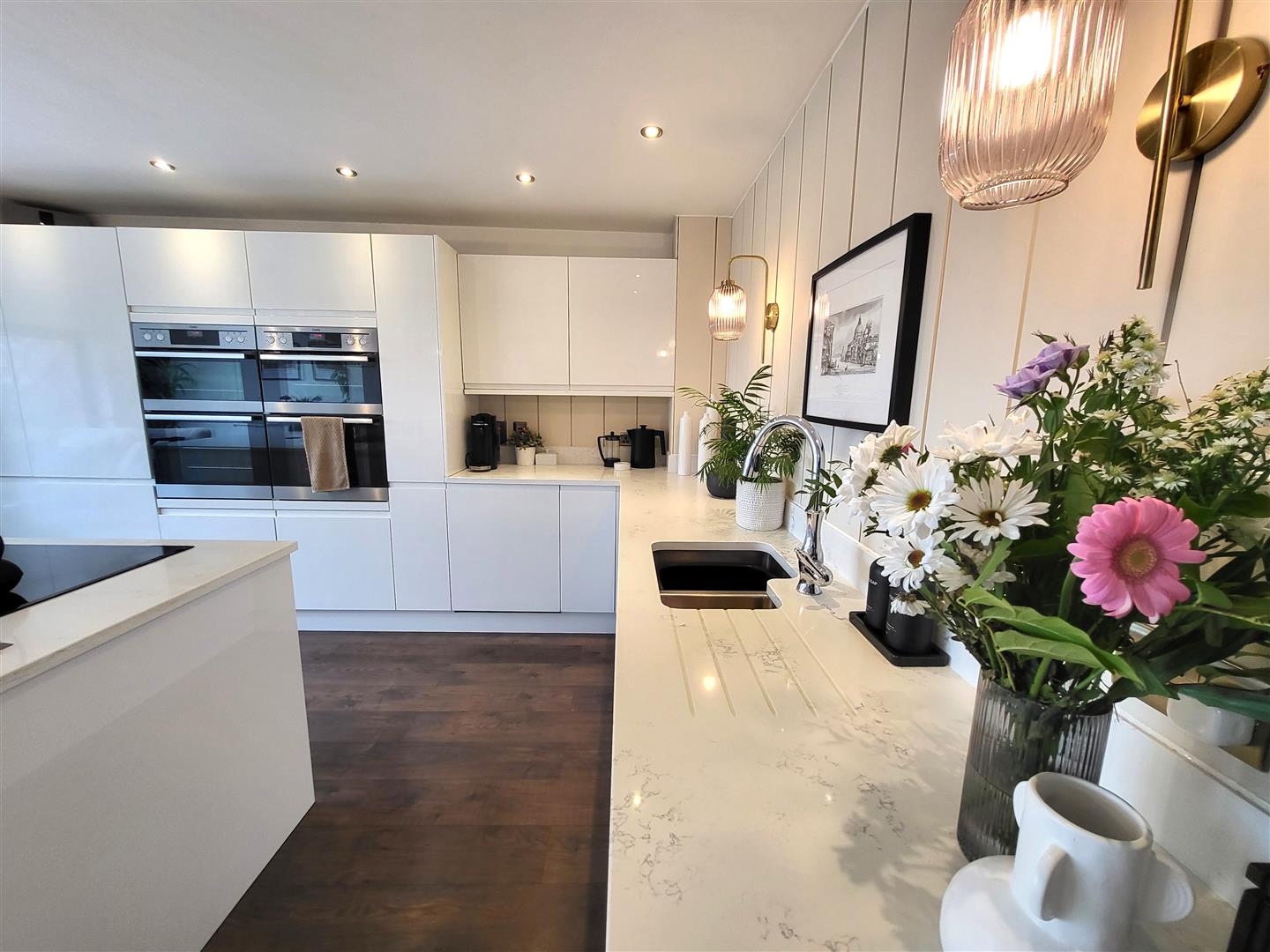Integrated kitchen with a surplus of units, integrated appliances, modern and contemporary features. Dining area with hard flooring.