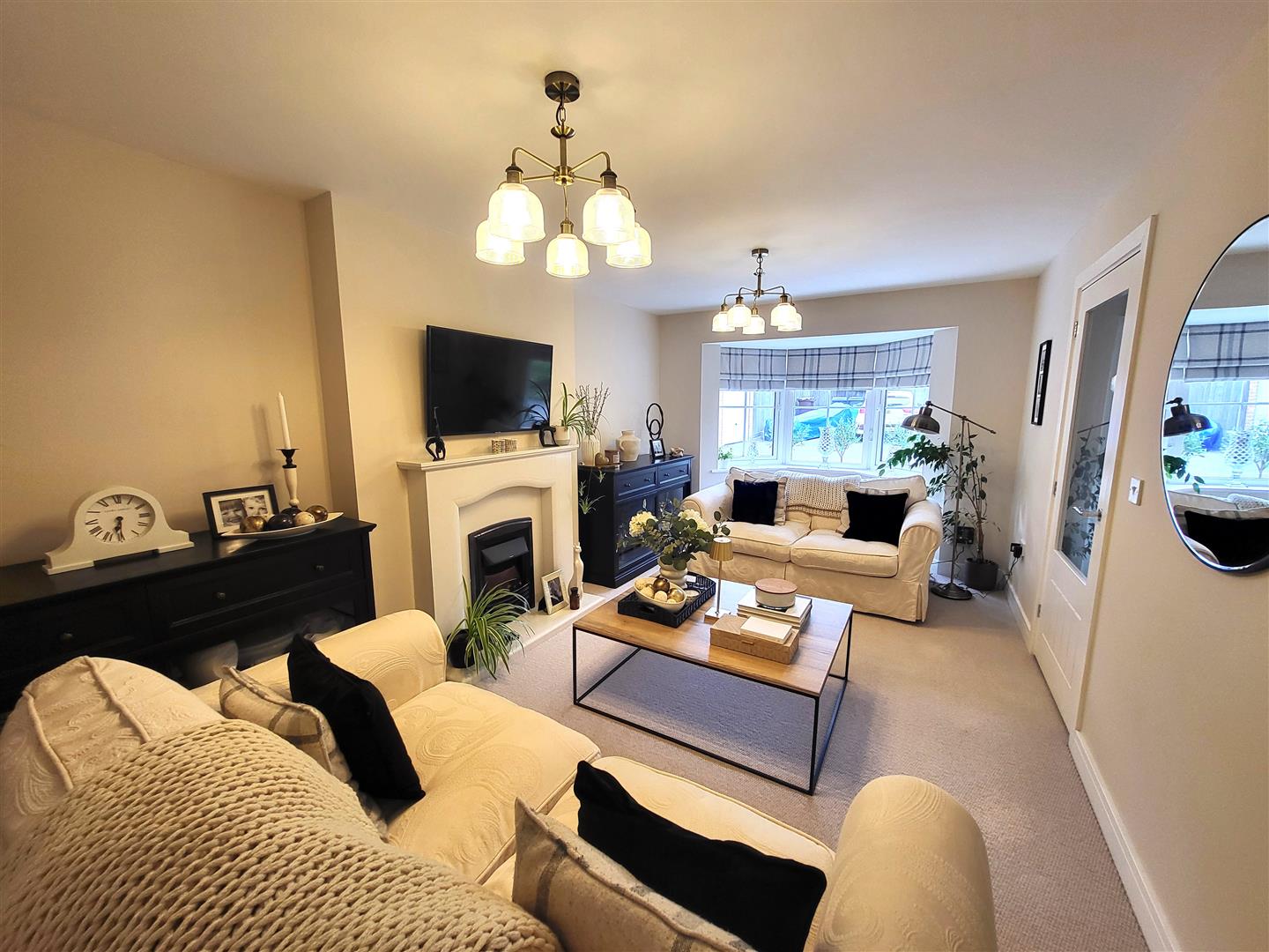 Carpeted lounge with bay window to the front of the house and feature fireplace.