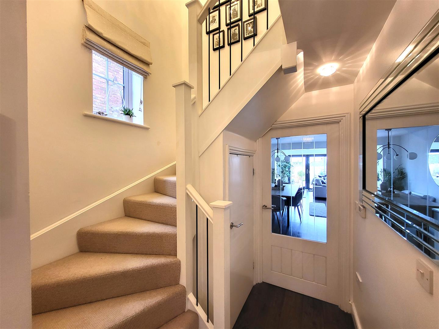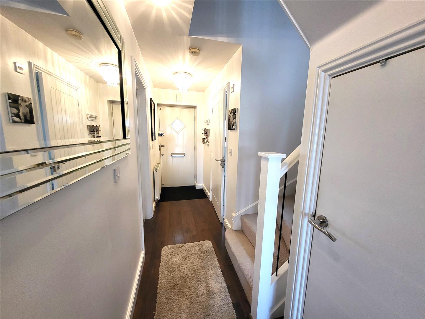 Hallway provides access to cloakroom, lounge, stairs and kitchen/diner/living room. With tasteful and neutral decor and hard flooring.