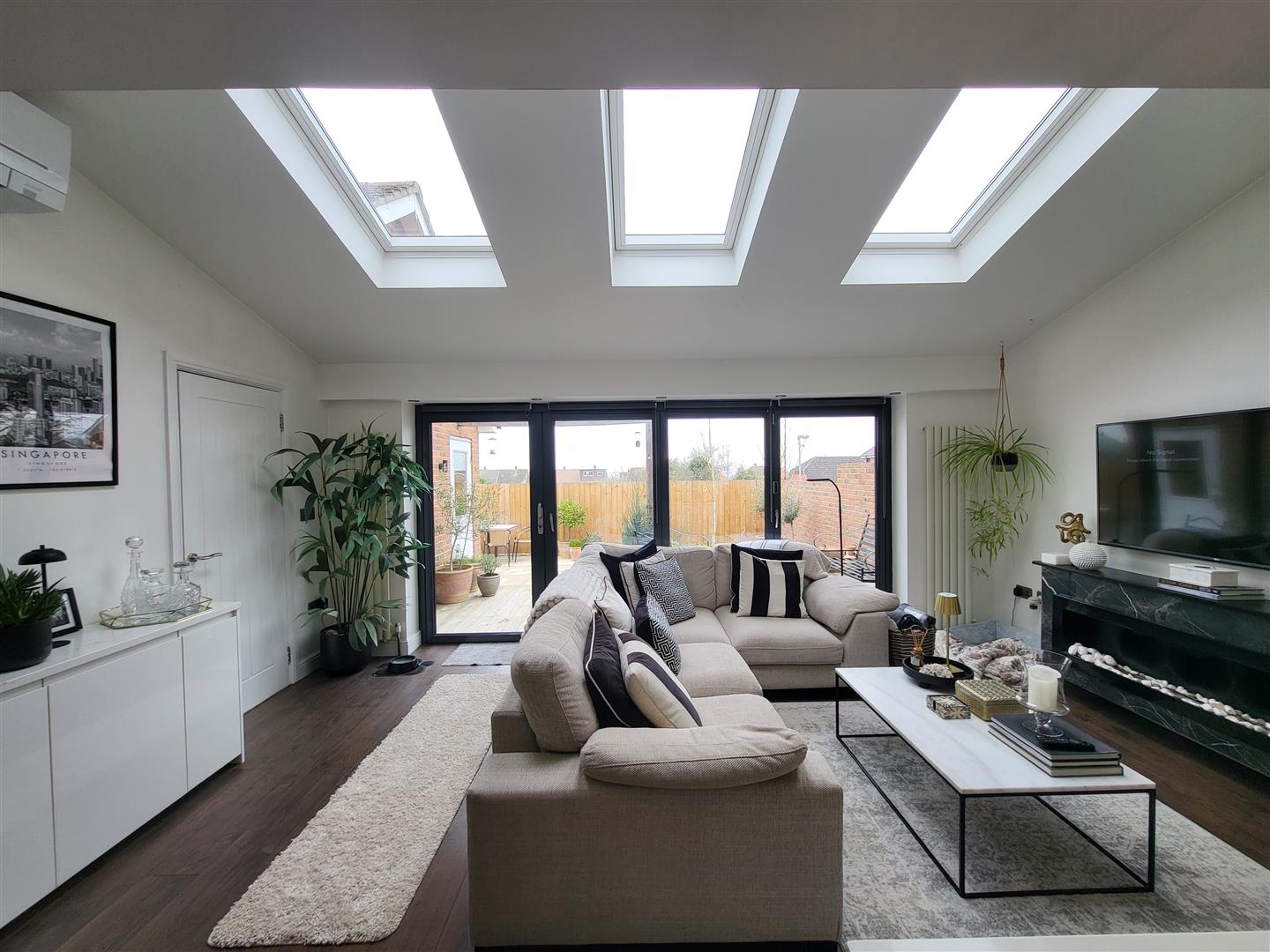 Open plan to kitchen/diner, hard flooring, bi-fold doors open onto rear garden with south facing terrace. Internal access from here to Garage. Roof windows allowing plenty of natural light. Air conditioning unit.