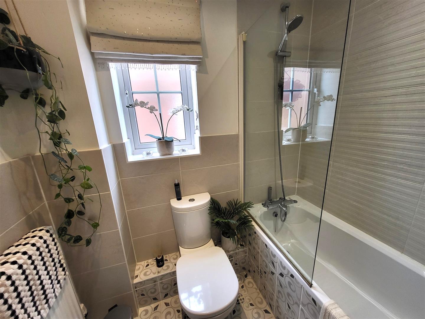 First floor bathroom with a bath and overhead shower, basin and toilet.