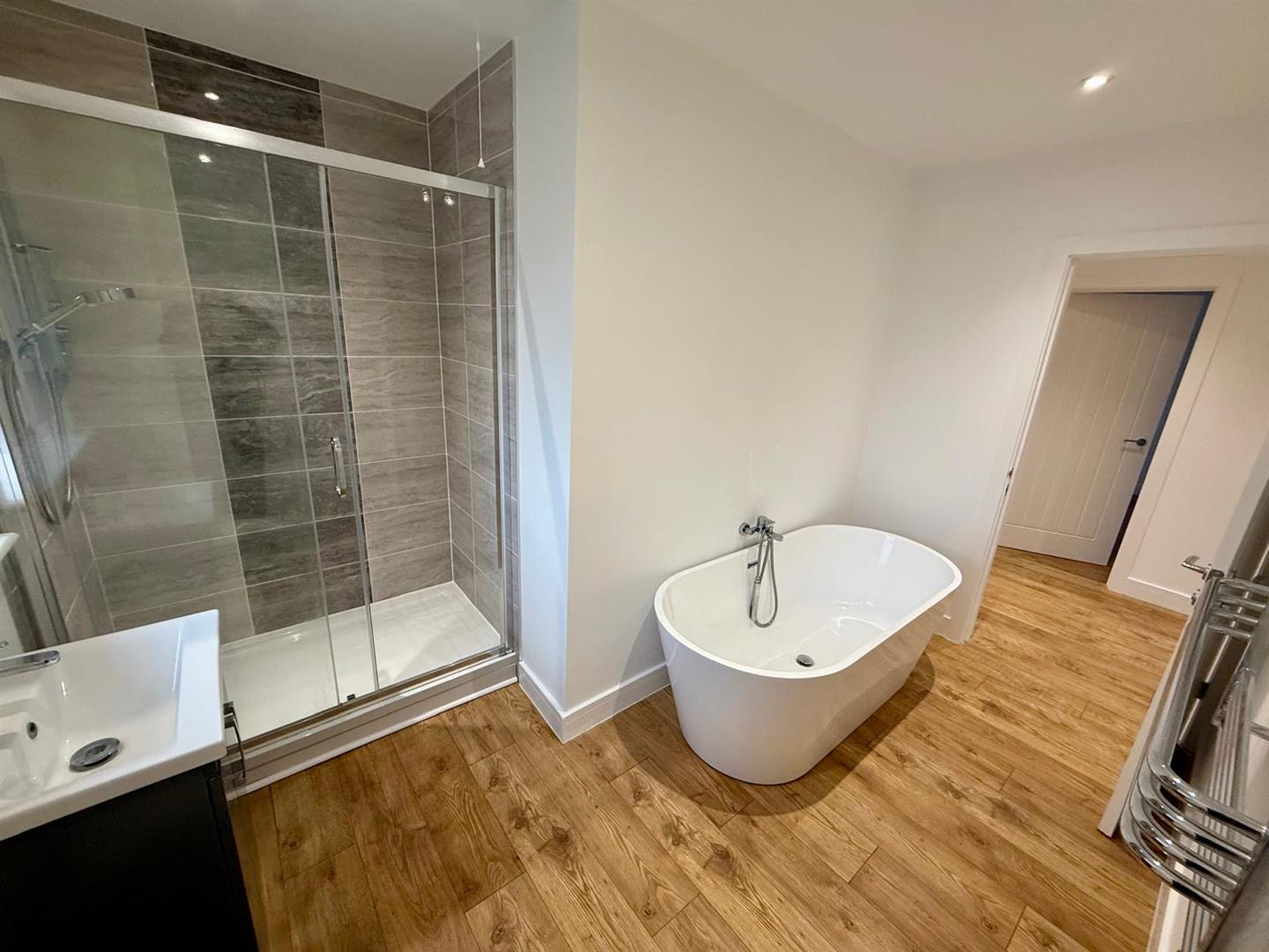 Beautiful spacious bathroom with white suite consisting of free-standing bath, separate shower with tasteful wall tiles, basin and WC, wood-effect LVT flooring with white walls, radiator and window to side of property.