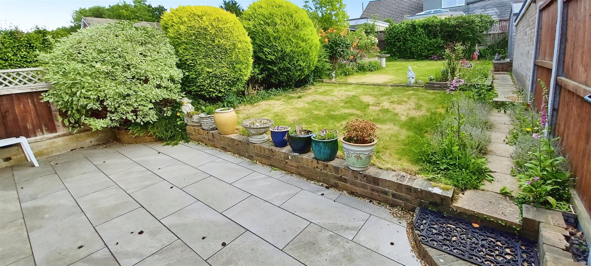 A spacious paved patio with plenty of room for garden furniture and BBQ leads onto a beautifully established peaceful and private lawn garden, with a lovely range of plants, shrubs and flowers, good size storage shed, gated side access out to garage and off road parking from here.