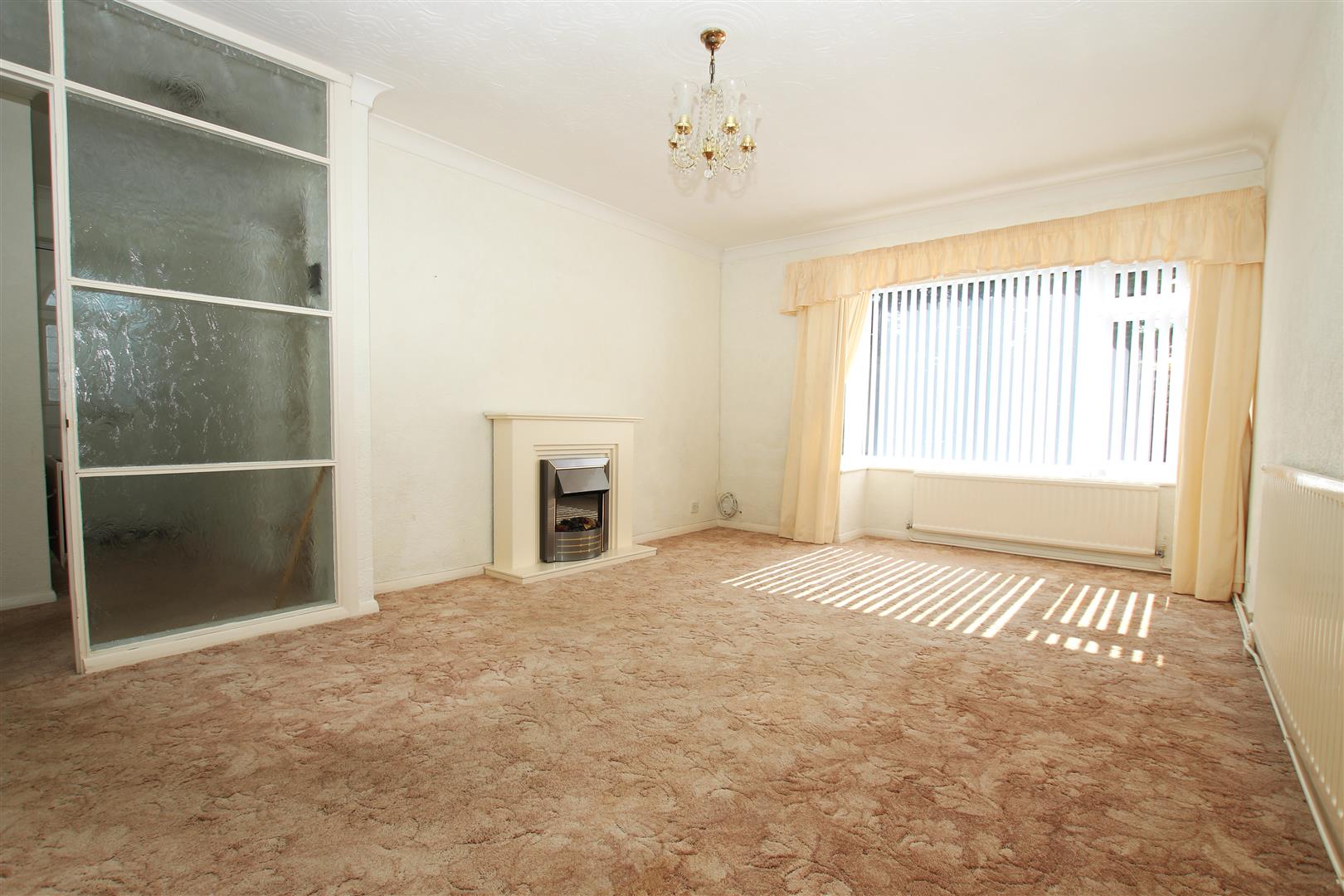Spacious room with plenty of space for sofas and table and chairs, with glass divide to side of door for extra natural light, bay window to front with fitted blinds and curtains, feature electric fireplace and surround, neutral carpet and decor.