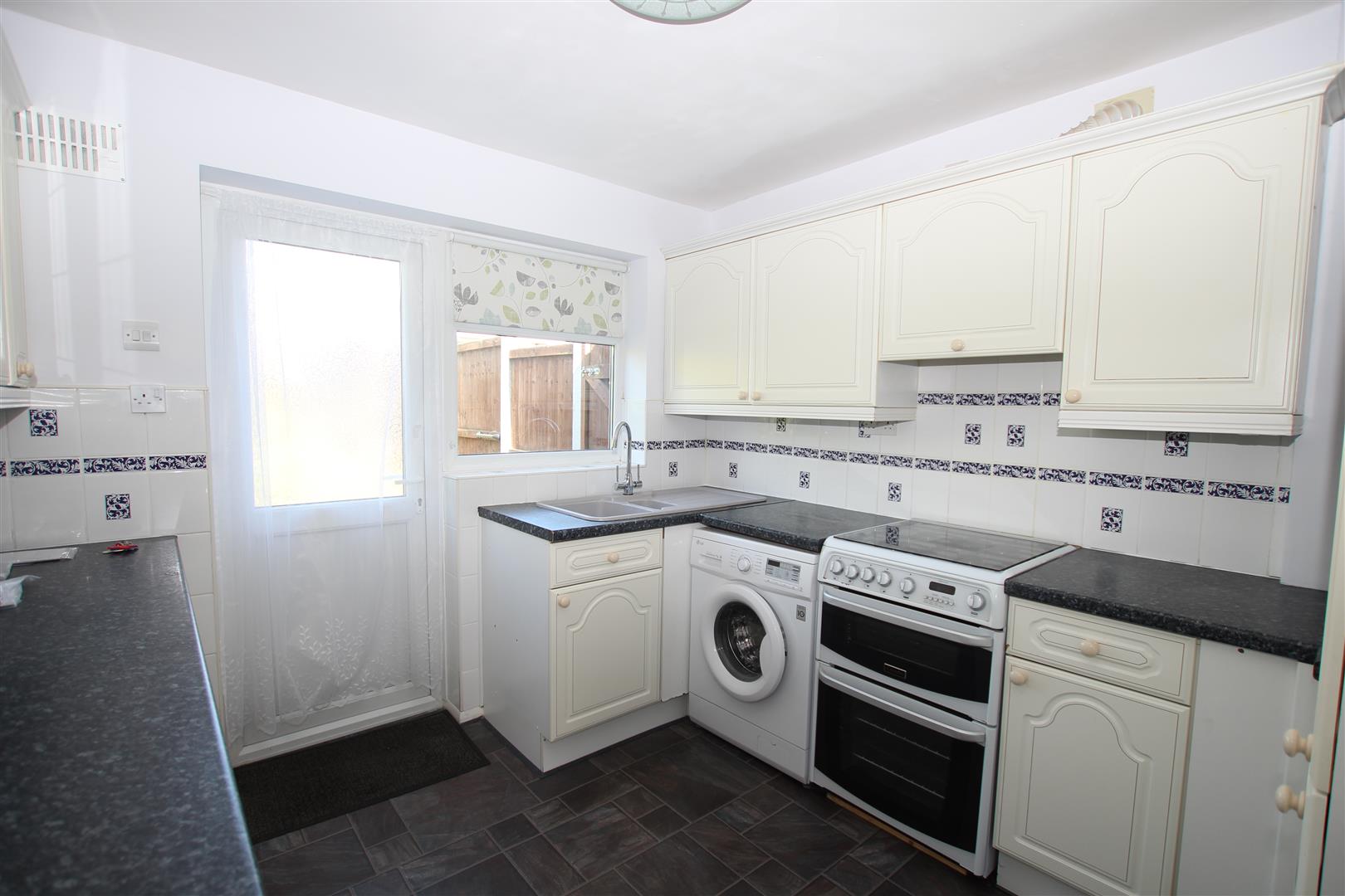 With good range of white wall and base units with contrasting grey vinyl worktops, white splashback tiles with decorative border feature, grey tile-effect vinyl flooring, separate gas hob/electric oven, washing machine and integrated fridge and freezer, boiler also located here. Door and window out to patio and garden from here.
