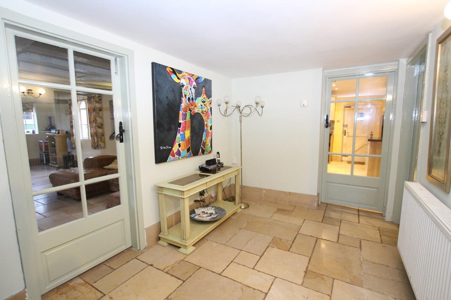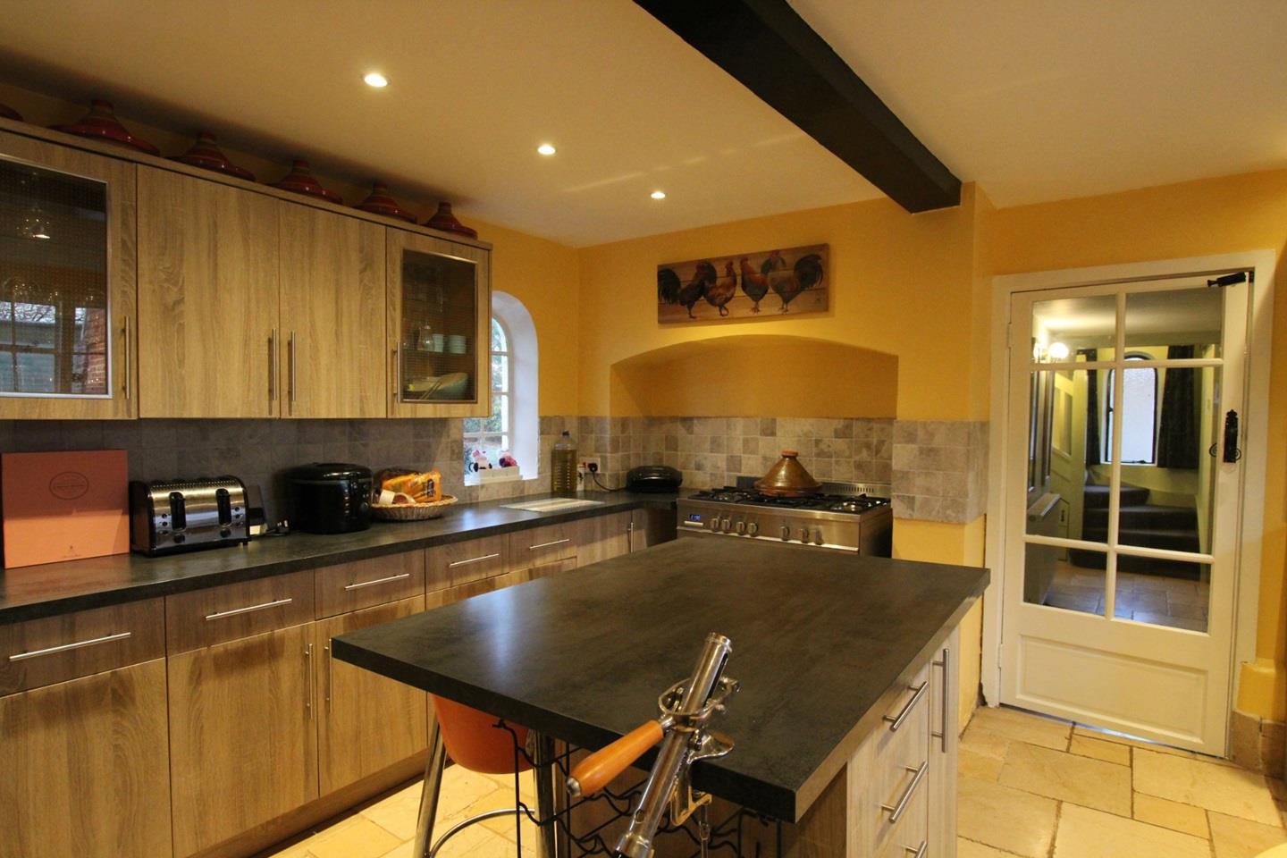 The downstairs accommodation has limestone flooring throughout. It comprises of a modern kitchen including an island, study, large hallway/boot room with stairwell and gallery landing, downstairs shower room and an exceptional main reception room which boasts a dual aspect fireplace with a log burner in situ.