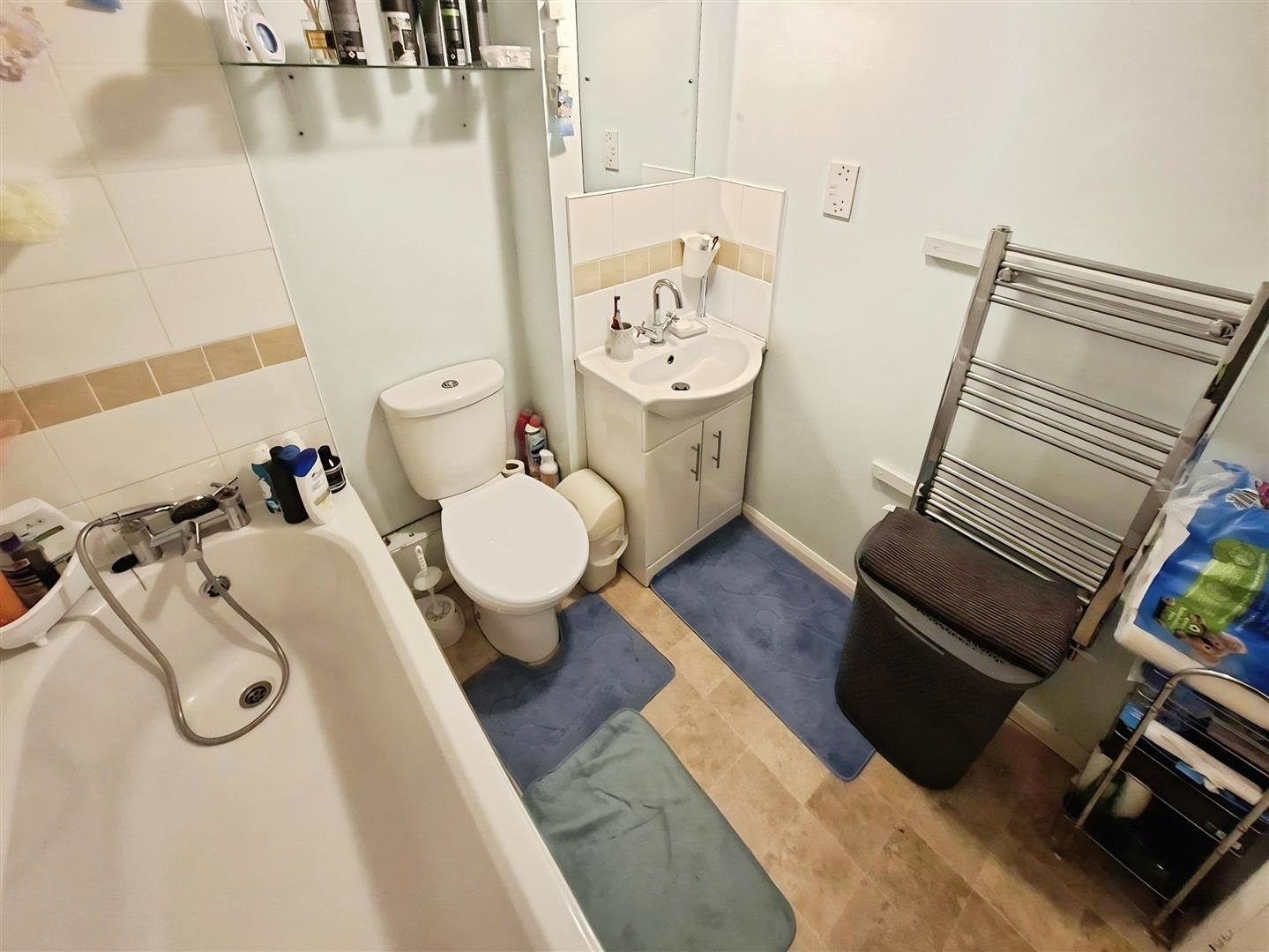 With white suite consisting of bath with shower attachment, WC and basin, partial white wall tiles with decorative border, high ceiling with skylight to rear, neutral vinyl flooring.