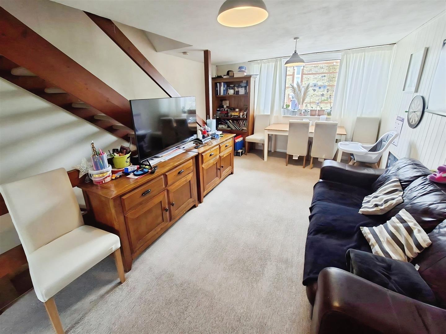 Good size room with plenty of space for table and chairs, sofas and other furniture, neutral carpet and decor with feature panel wall, window to front, "open" hatch and doorway into the kitchen from here to the rear of the room, stairs up to second floor also.