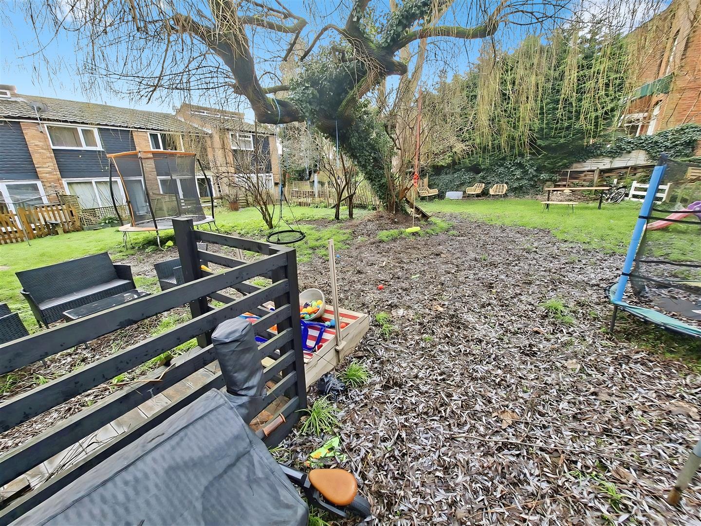 Low maintenance private rear garden space with artificial lawn, shingle, and picket fence, leading onto what we understand to be a further shared open space.