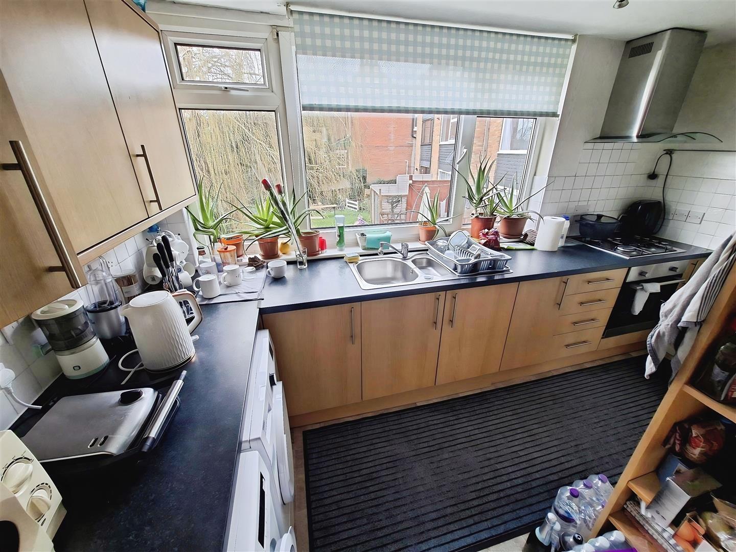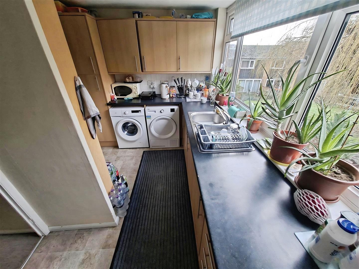 "L-shaped" kitchen, with good range of wooden wall and floor cupboards with contrasting vinyl worktops, neutral decor with white splashback tiles, large window to rear of property, neutral vinyl flooring, integrated gas hob and oven, space for washing machine and fridge-freezer.