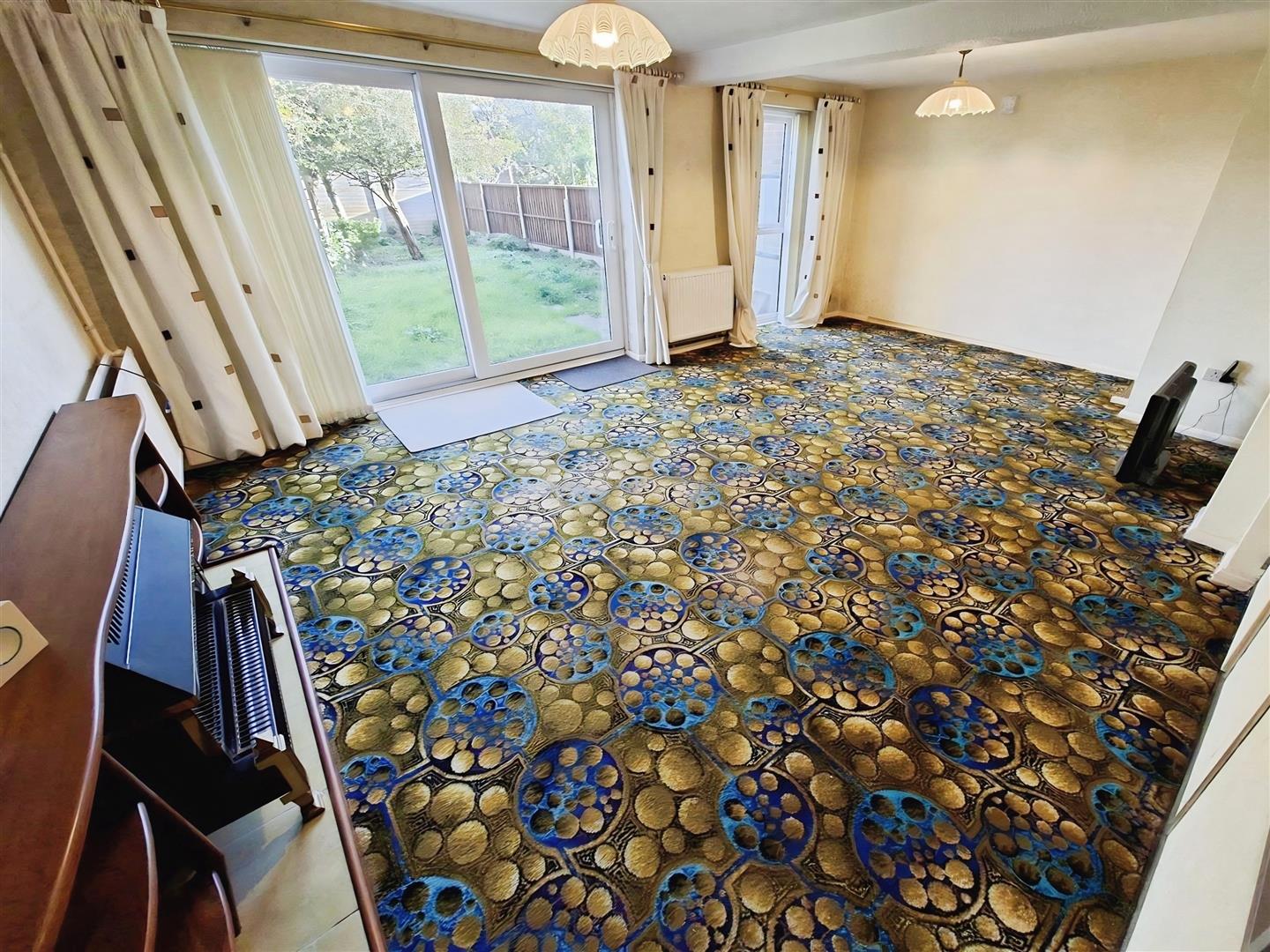 Great size lounge/diner with glass divider to stairs up to first floor, neutral carpet and decor, electric fireplace, floor-to-ceiling window to rear with fitted blinds, patio doors out to garden, built-in cupboard to one corner of room.