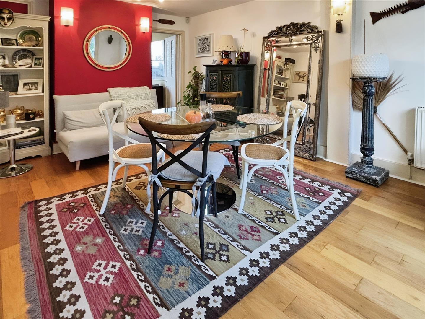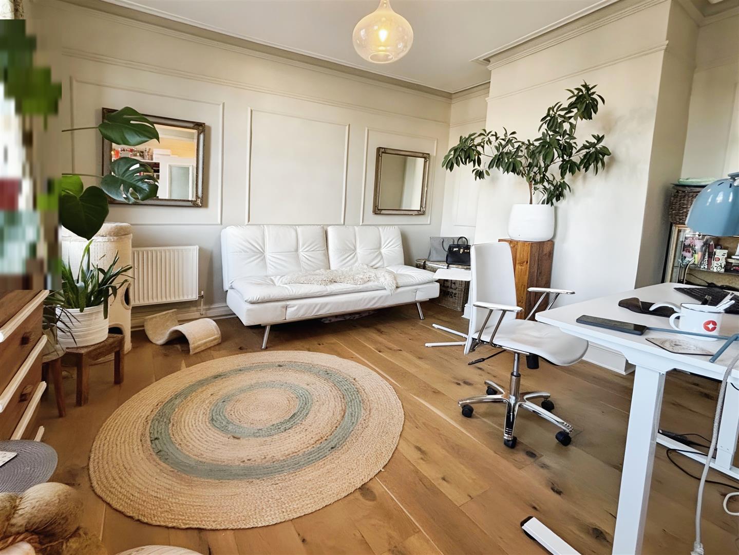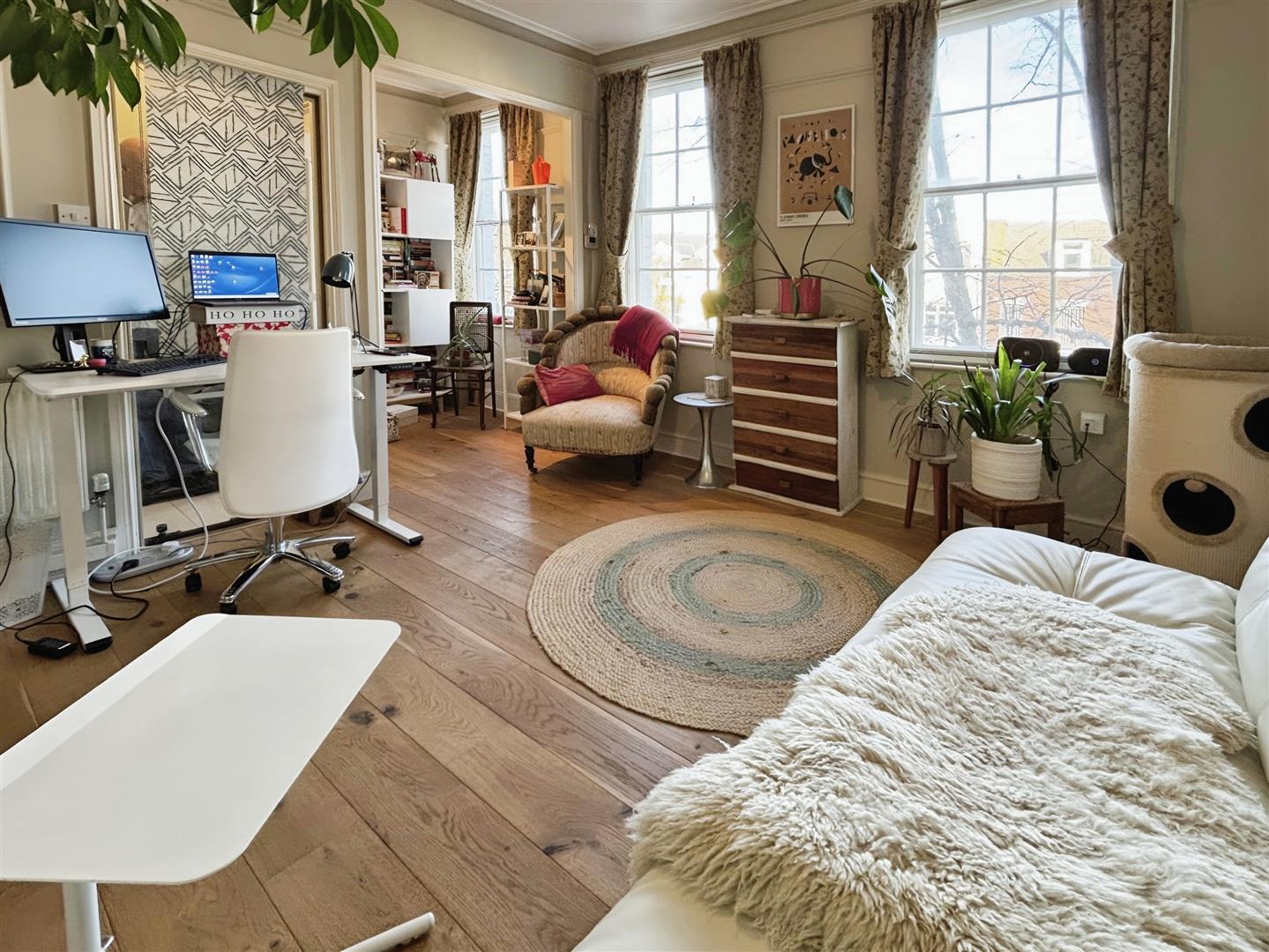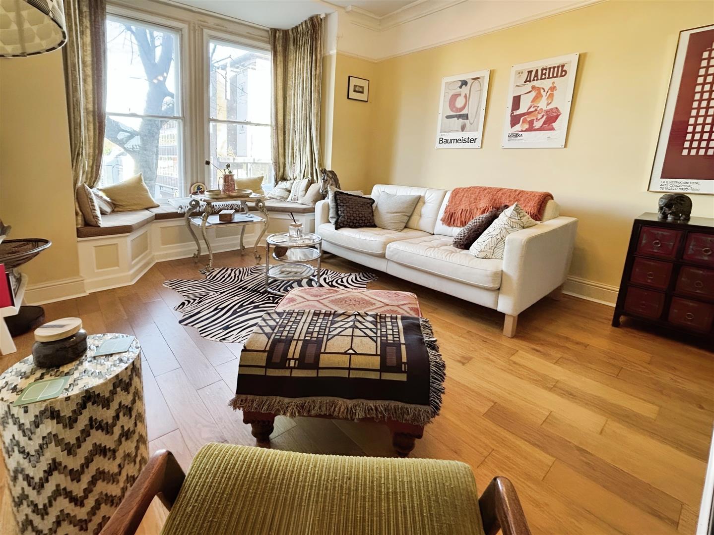Beautiful room with large bay sash window to front of house with secondary glazing, lovely built-in bay seating, engineered oak flooring and neutral decor with picture rails.