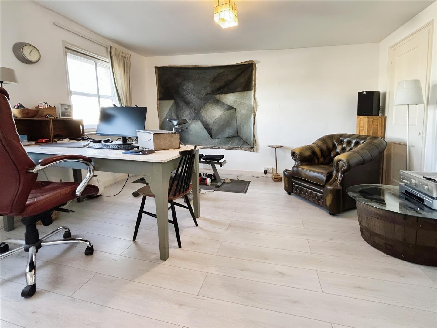 Good size bedroom currently used as an office, with two sash windows to front of house with secondary glazing, grey laminate flooring with white walls, built-in cupboard.