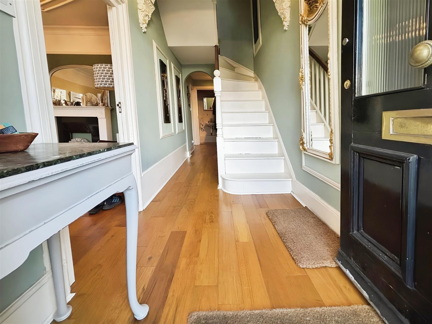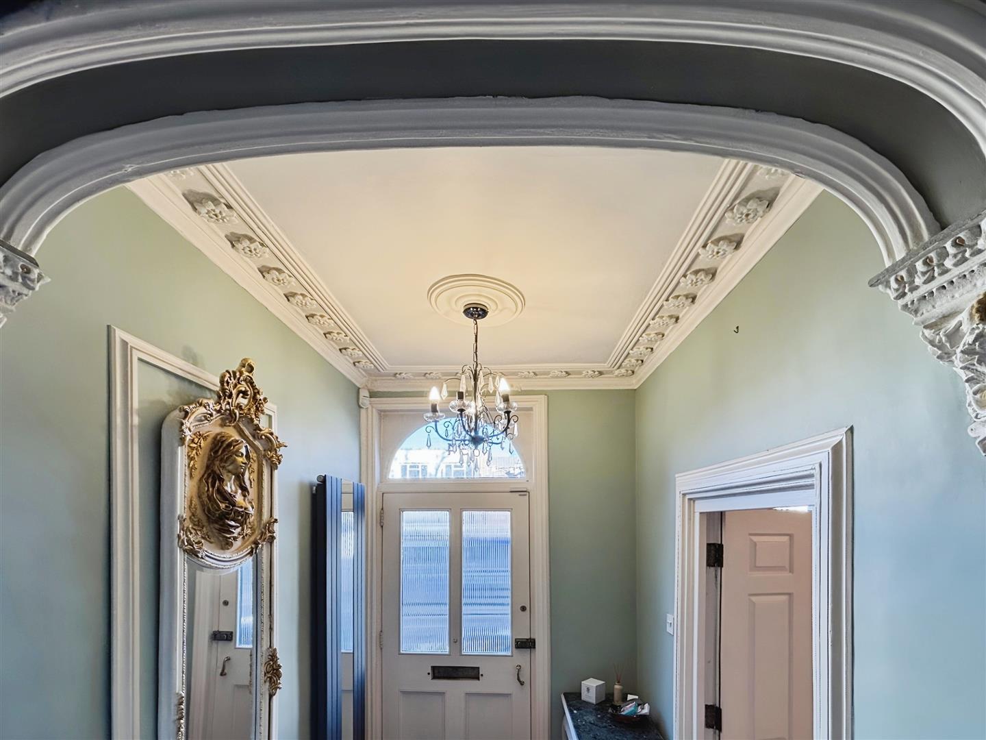 Characterful and spacious hallway with impressive light and ceiling rose feature, wall panels, original archway and feature vertical radiator/mirror, giving access to the lounge, dining room, WC, stairs up to the first floor, and door down to basement room.