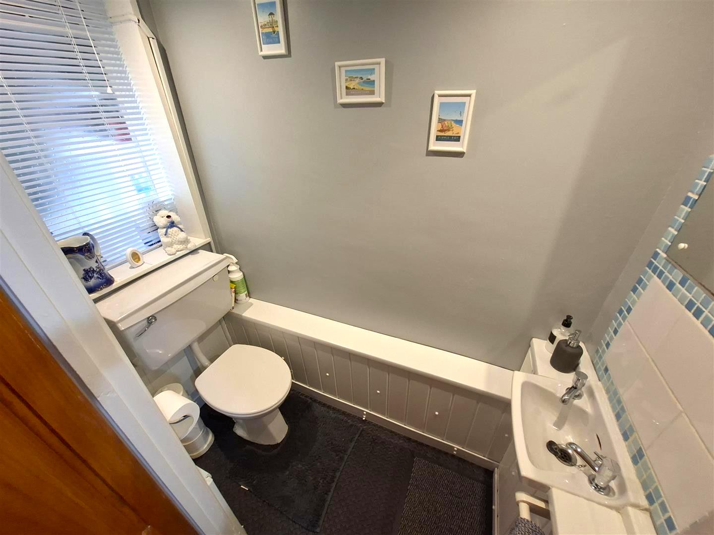With white site consisting of WC and basin, neutral decor with feature splashback tiles, window to rear into garden room, panelled ceiling with downlighters.