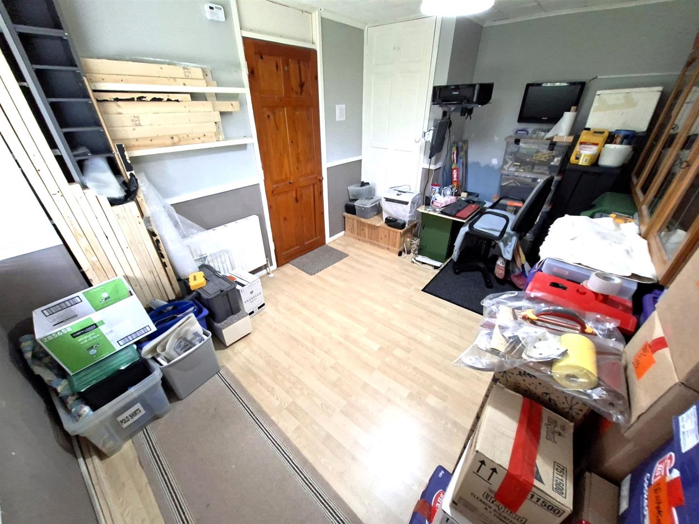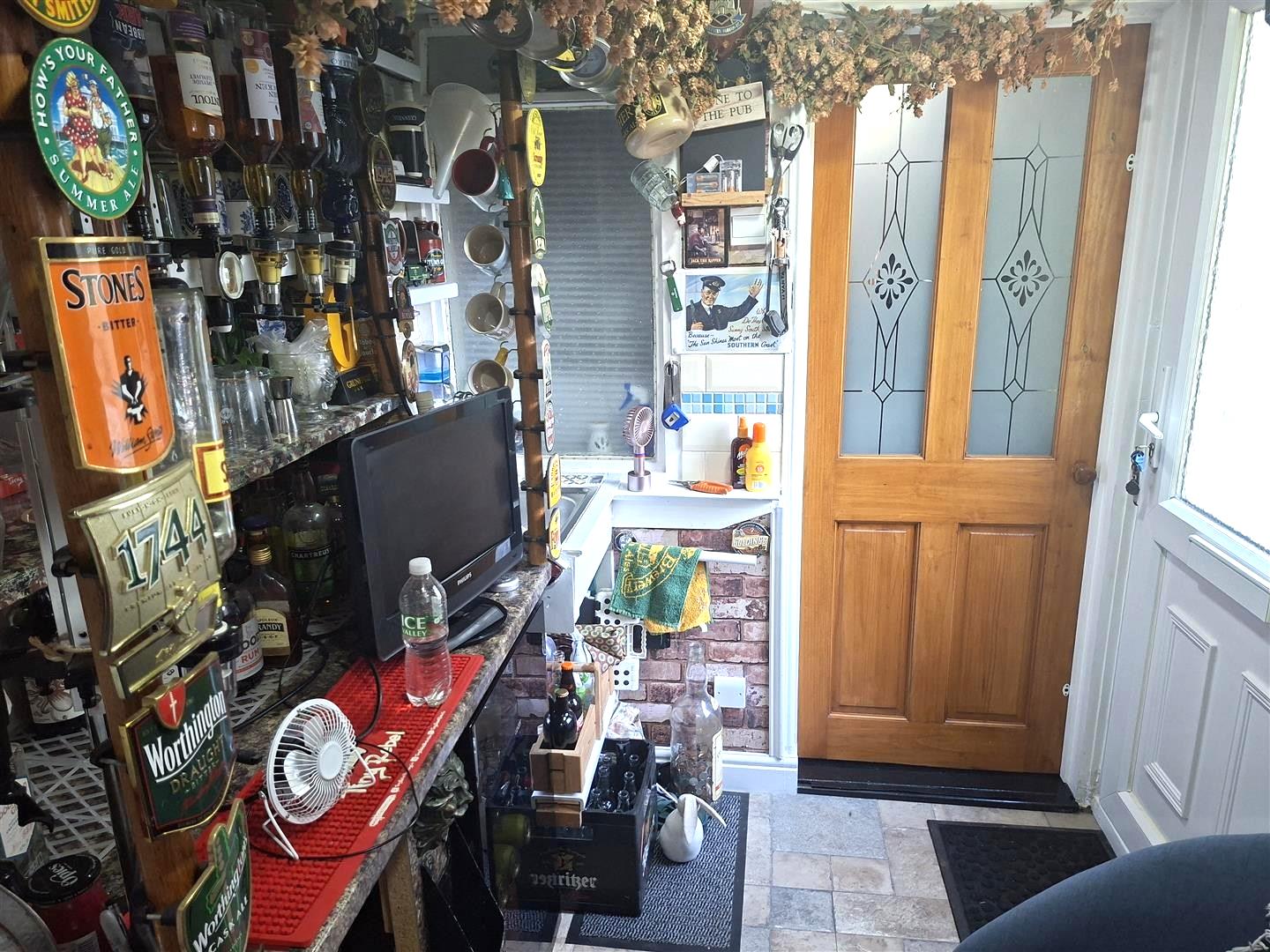 Front door into this useful storage room currently used as a bar, with tile-effect vinyl flooring and neutral decor with feature wall, window to side, basin, built-in shelving, recent refurbished roof, door from here into hallway.