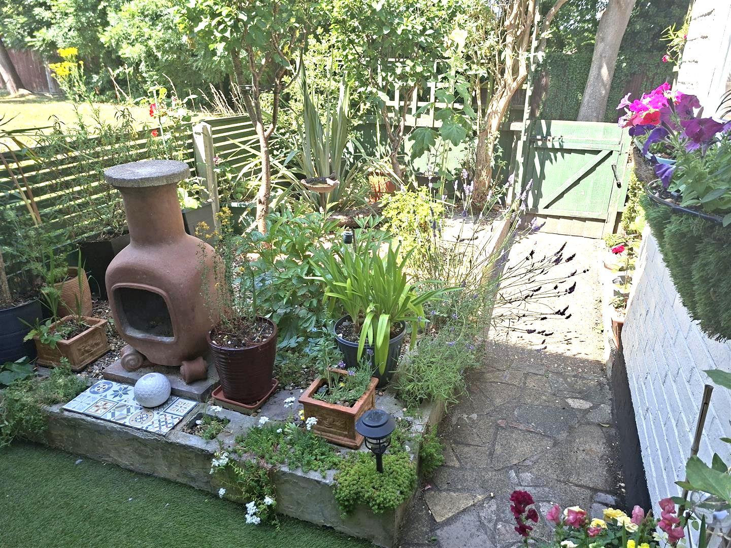 Beautifully established and gated front garden area with raised planters boasting a lovely selection of colourful flowers, plants and shrubs, artificial lawn area, plenty of space for BBQ, pathway leads to front door.