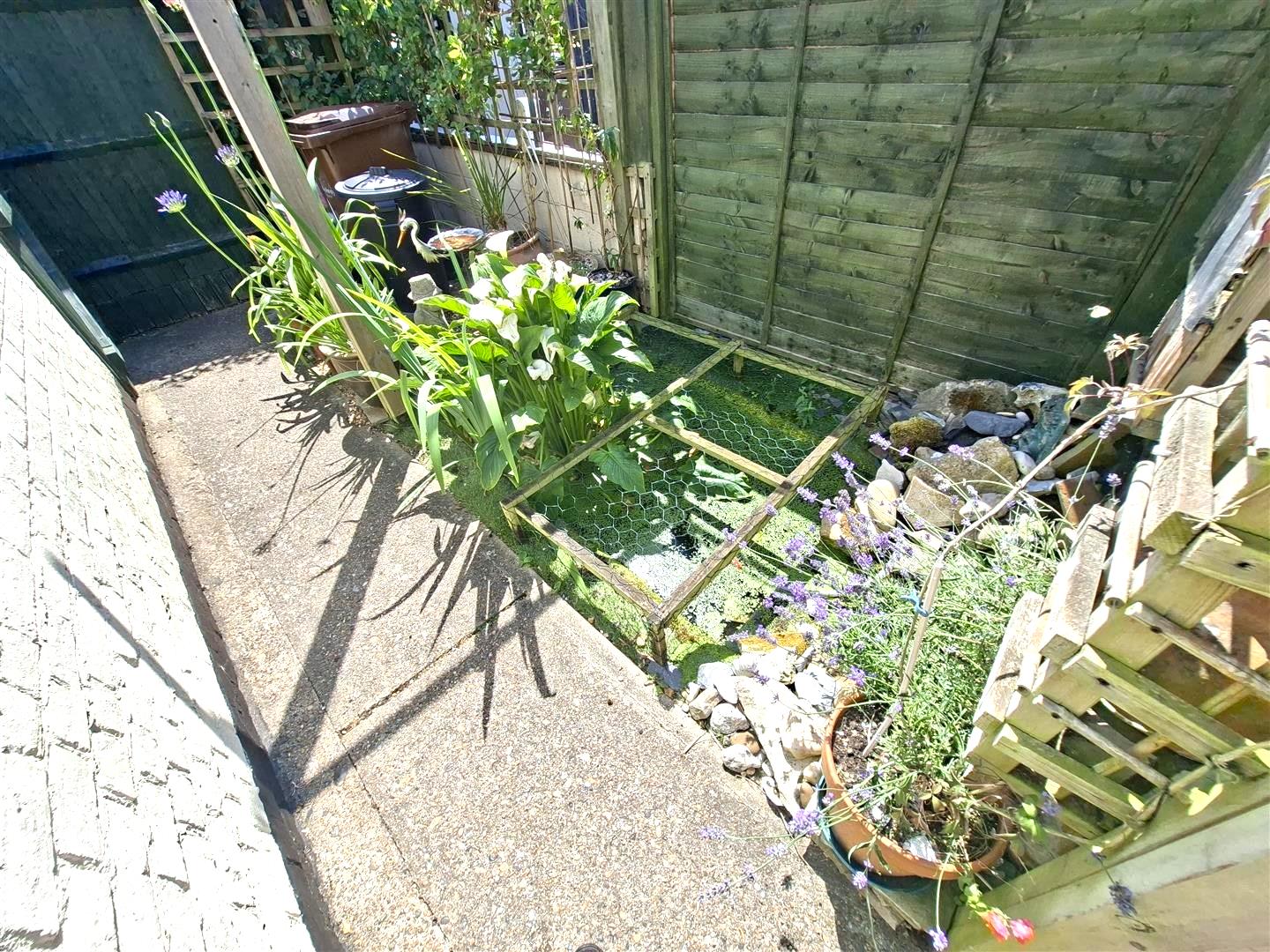 With decked patio area leading to the lovely low-maintenance paved garden, with artificial lawn area, beautiful raised planters bordering this fully fenced and private space, leading to a pathway with garage and rear access to one side, and a covered seating area with pond and hard-standing to the other side.