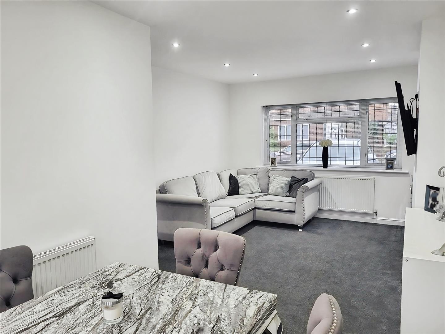 Lounge/dining room with large window overlooking the front of the property, modern neutral carpet and decor, radiators and double doors to rear garden.