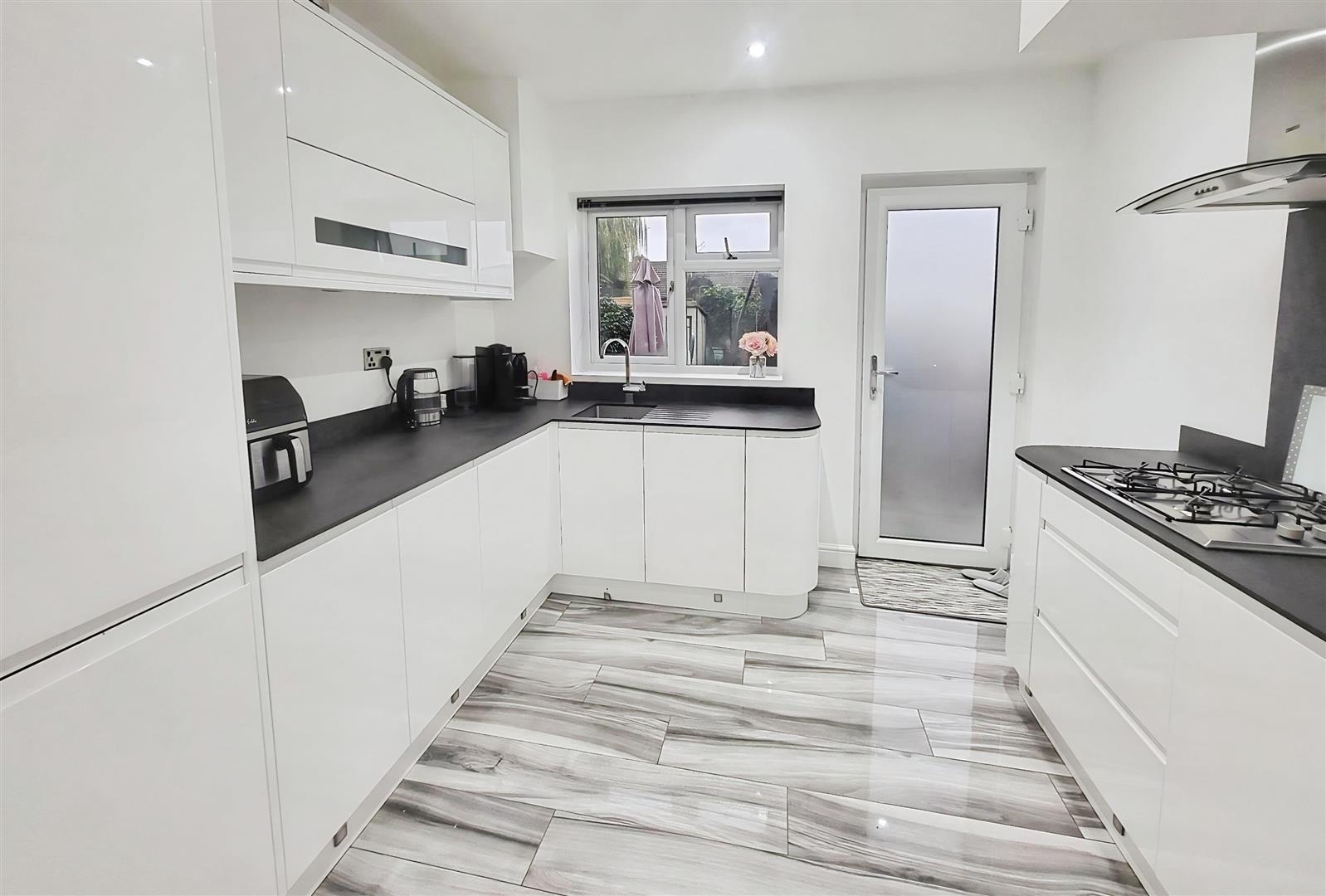 Modern kitchen with a range of white gloss wall and base units. With integrated fridge freezer, oven, microwave, washing machine and slimline dishwasher. Rear door to garden.