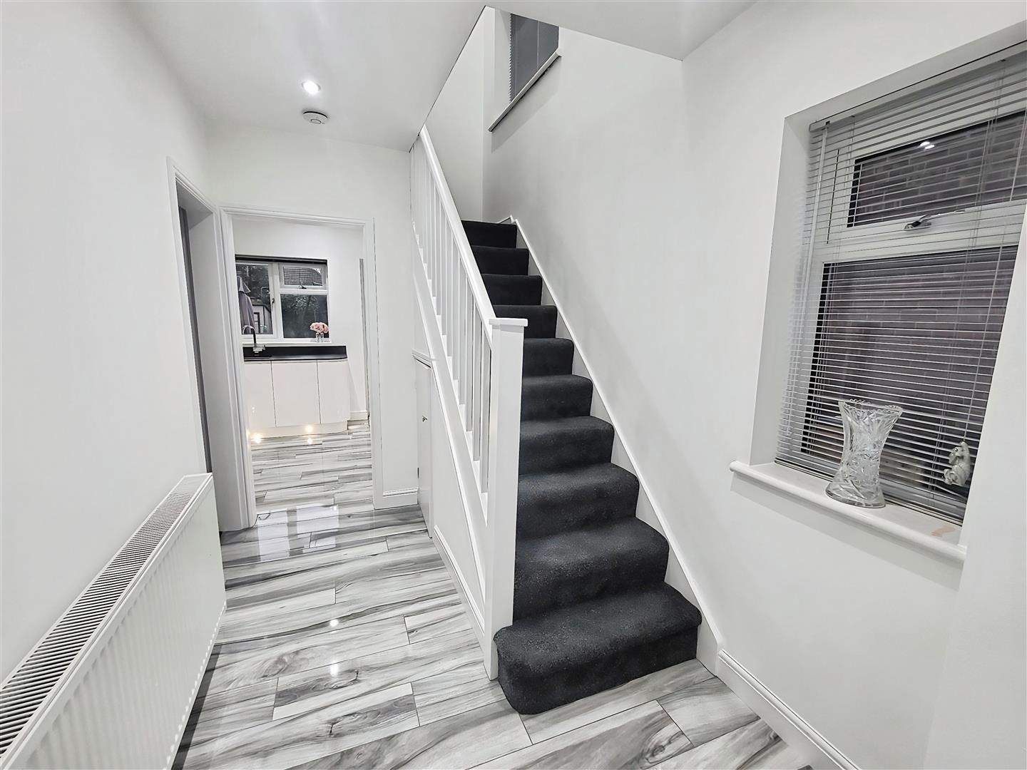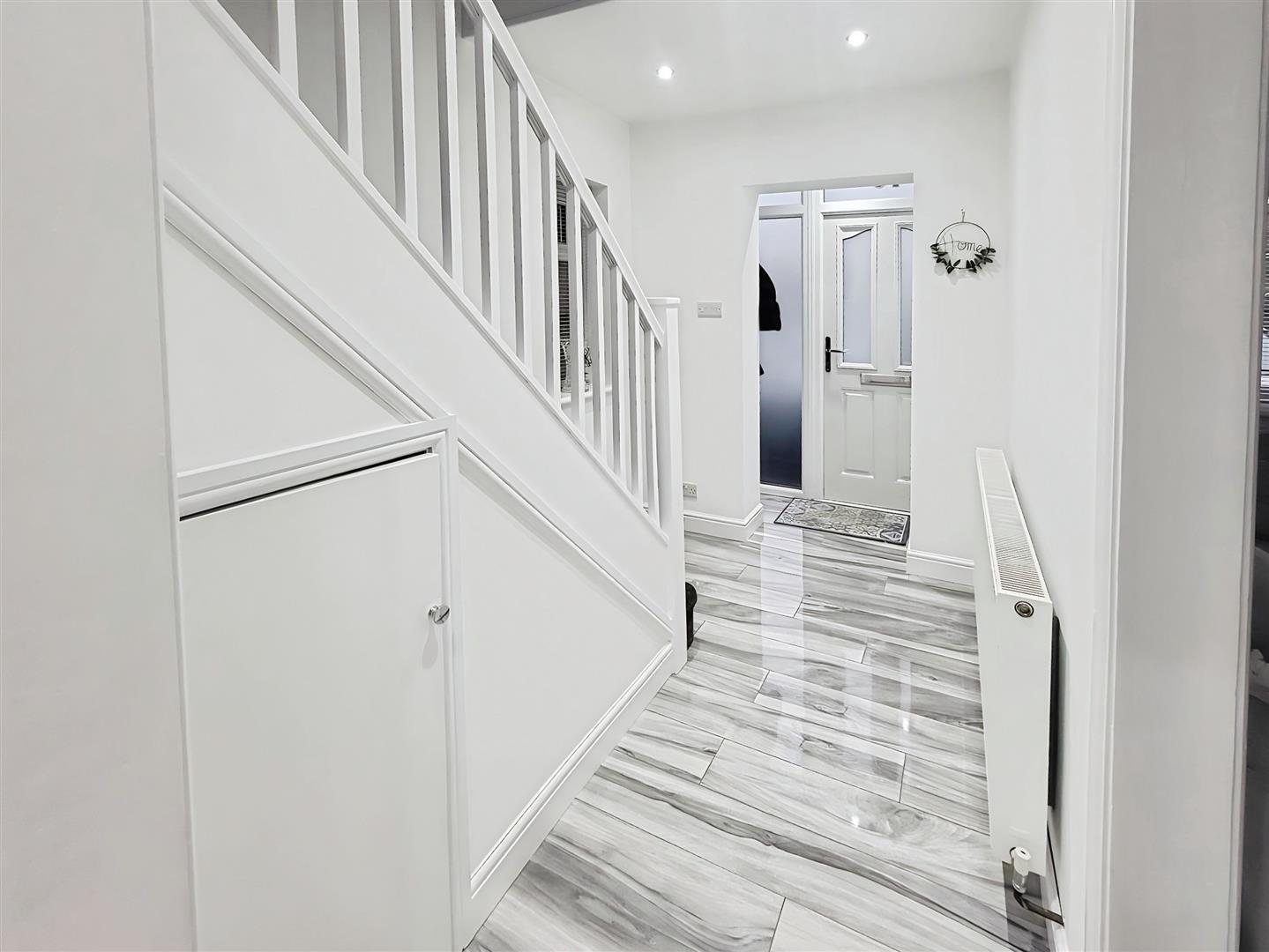 Bright and light entrance hall with porcelain tile flooring, window to the side and under stairs storage cupboard.