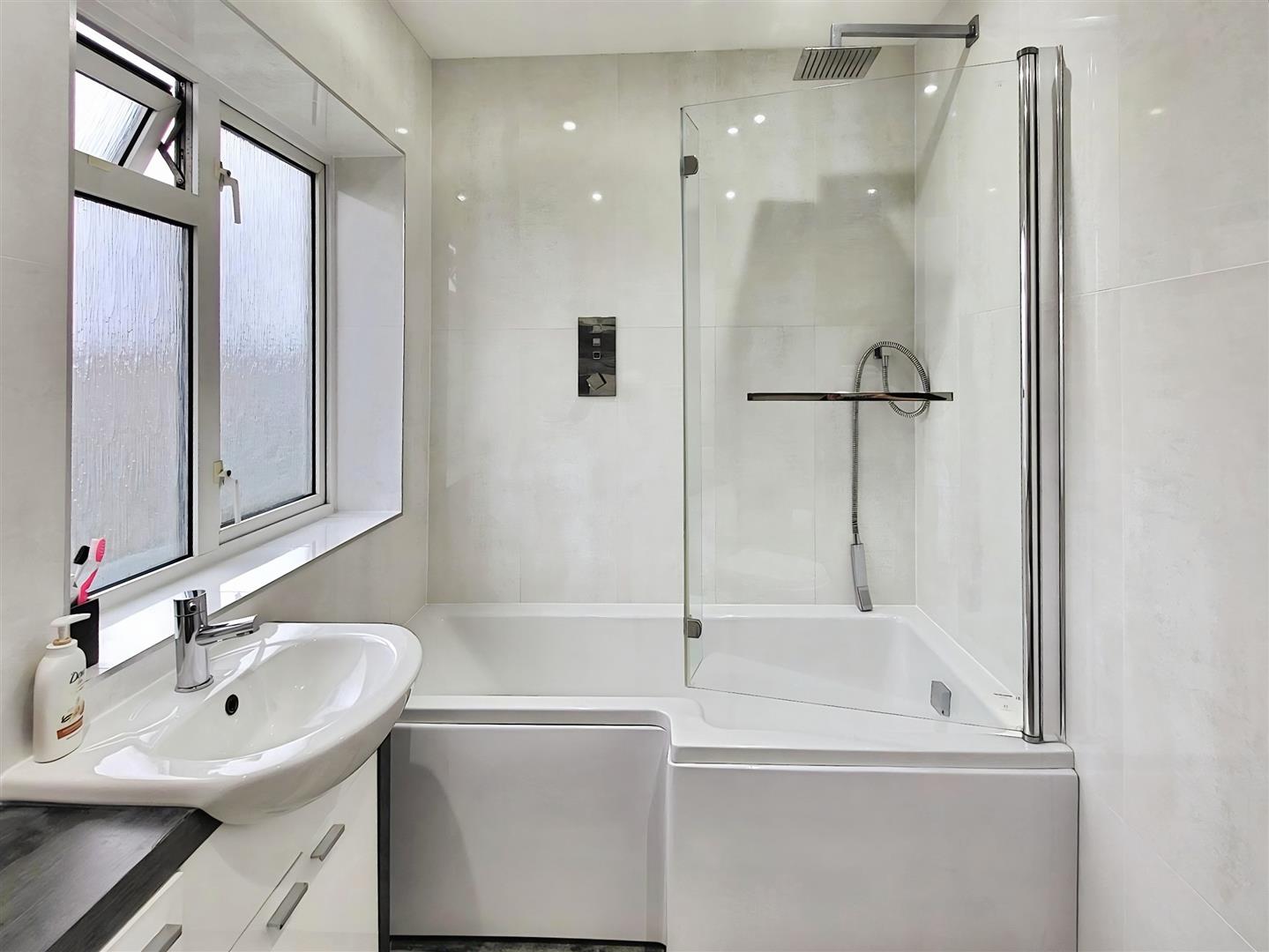 White suite with vanity unit, bath and overhead shower, tap and shower heads controlled via fitted panel to tiles.