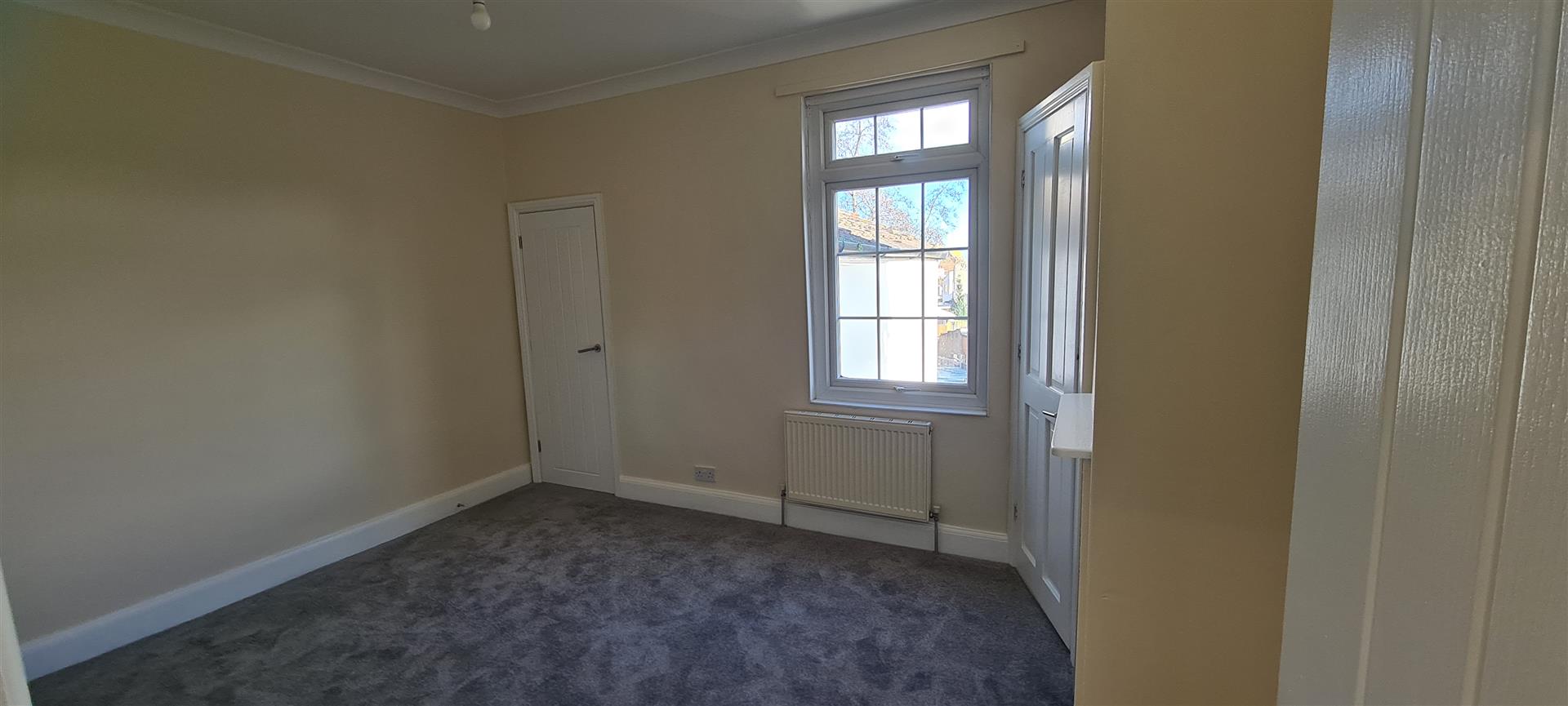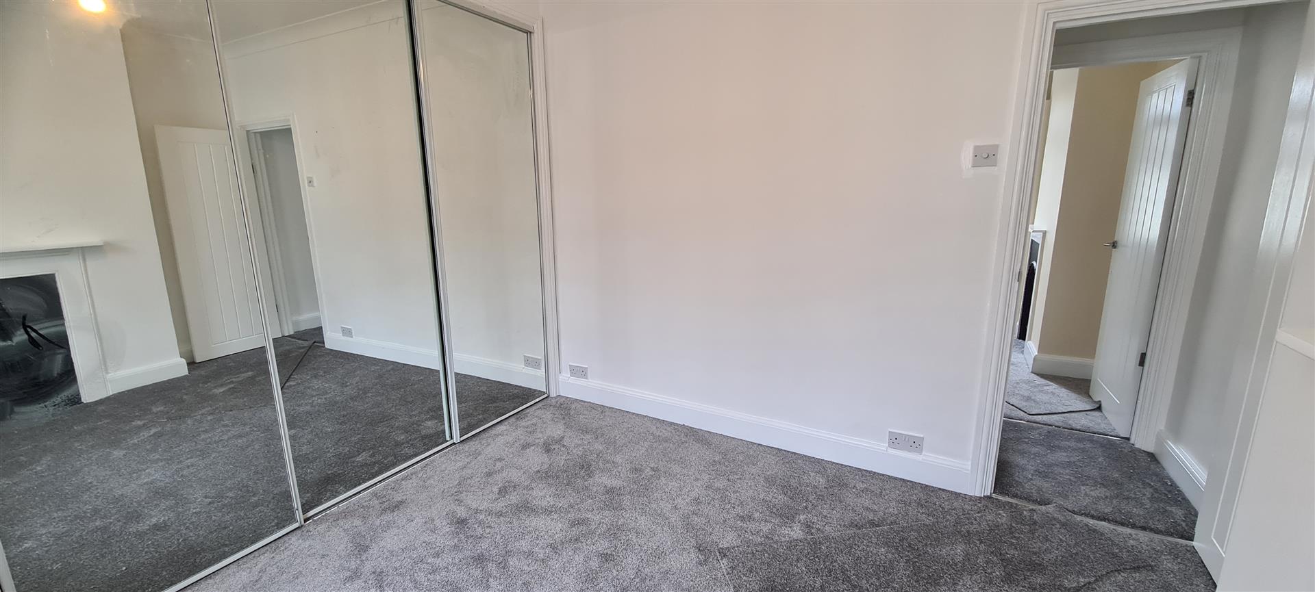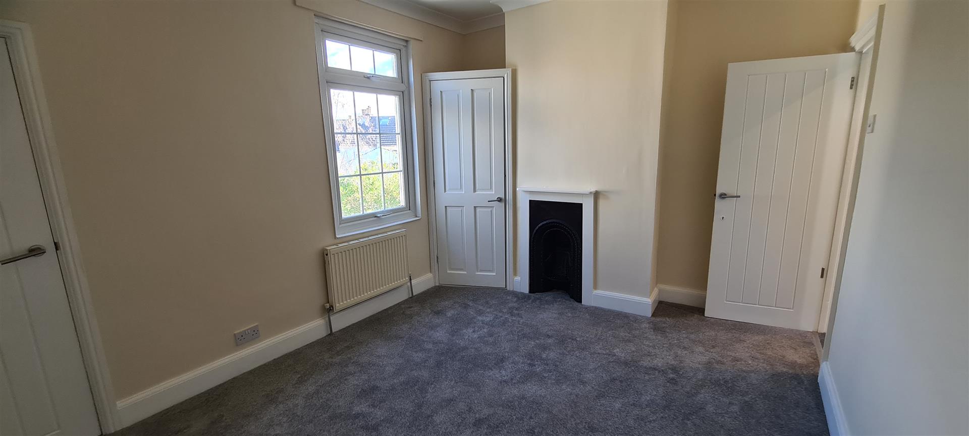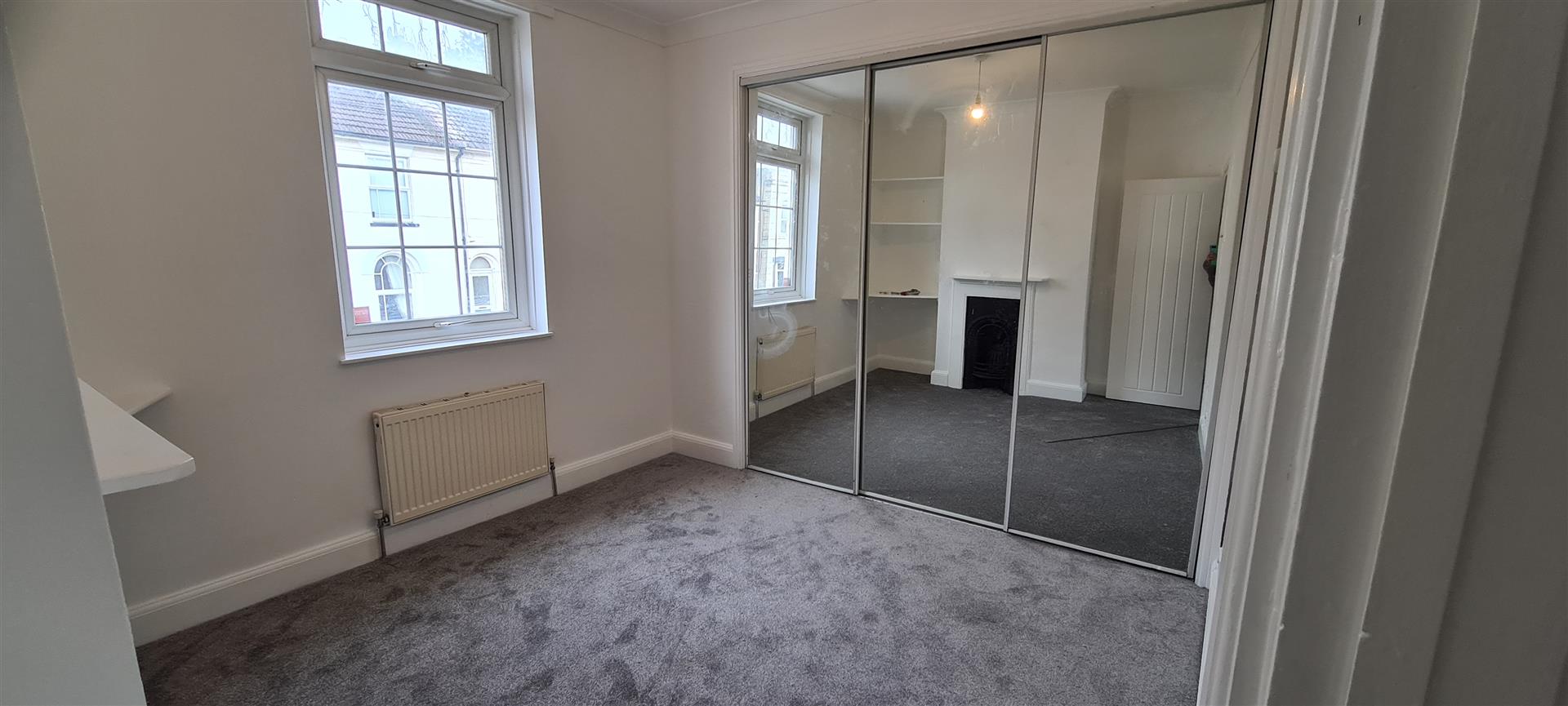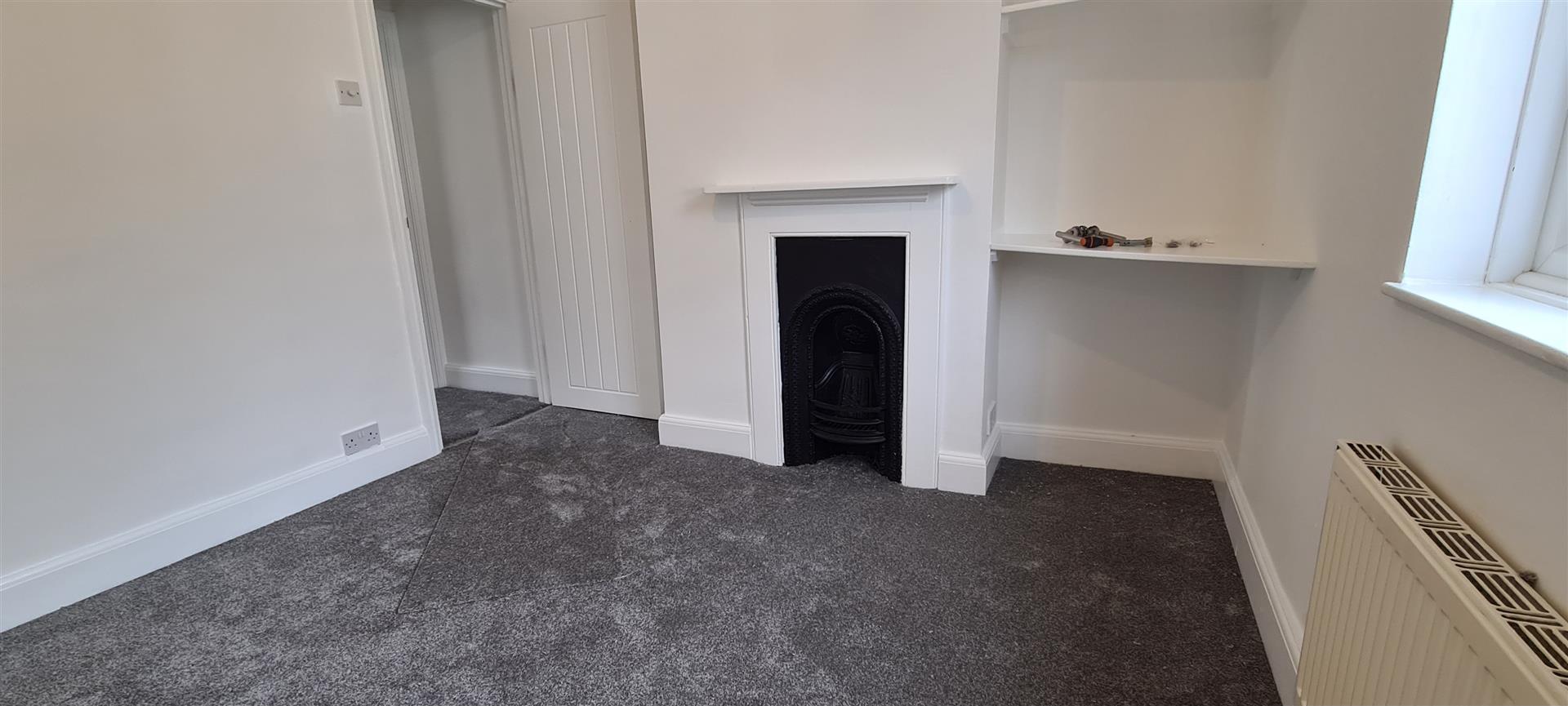 Further double bedroom with built-in cupboard (housing water tank), original feature fireplace, window to rear of property, neutral carpet and decor.