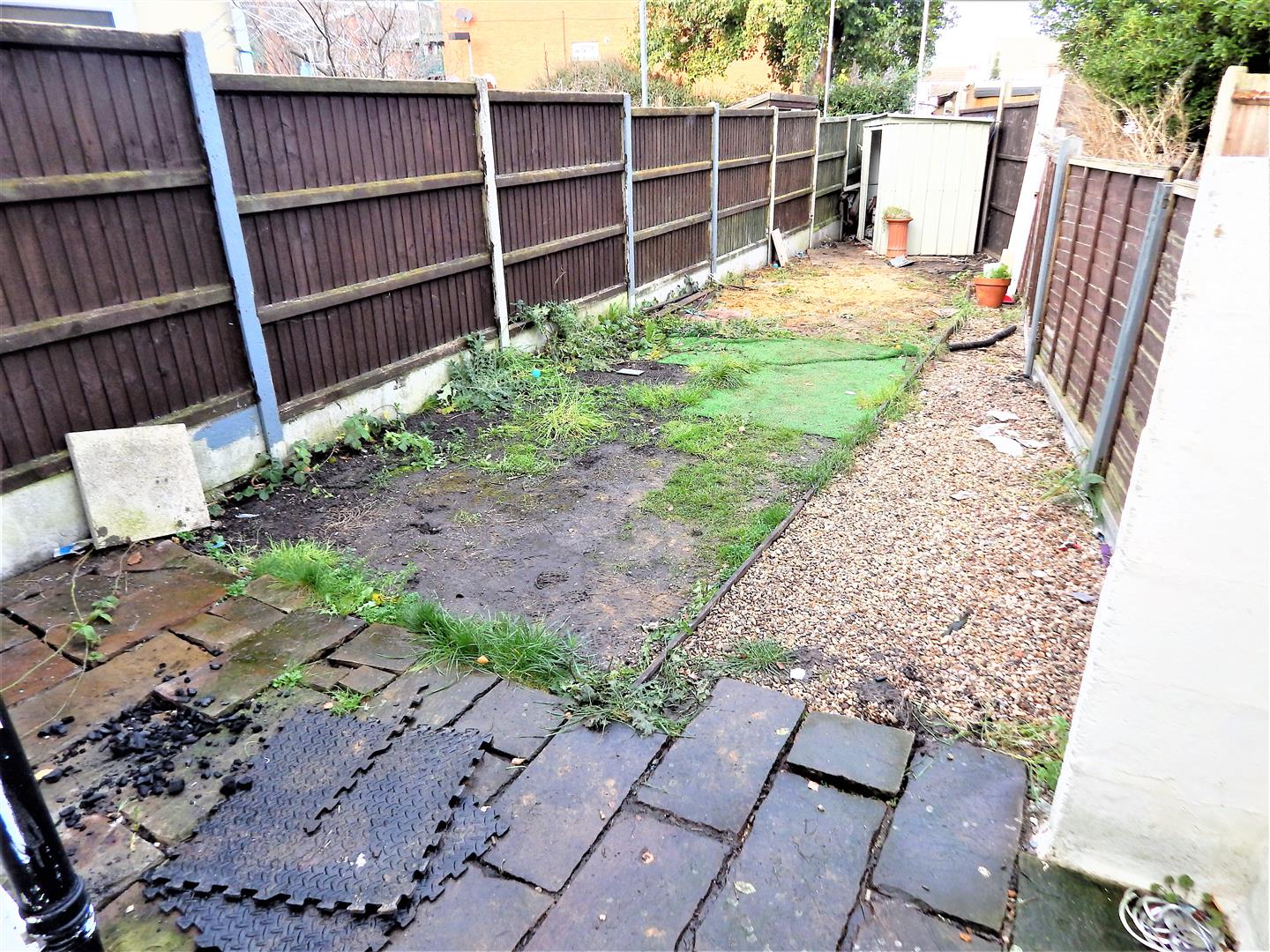 With hard standing patio, shed, all fully fenced with gate to rear.