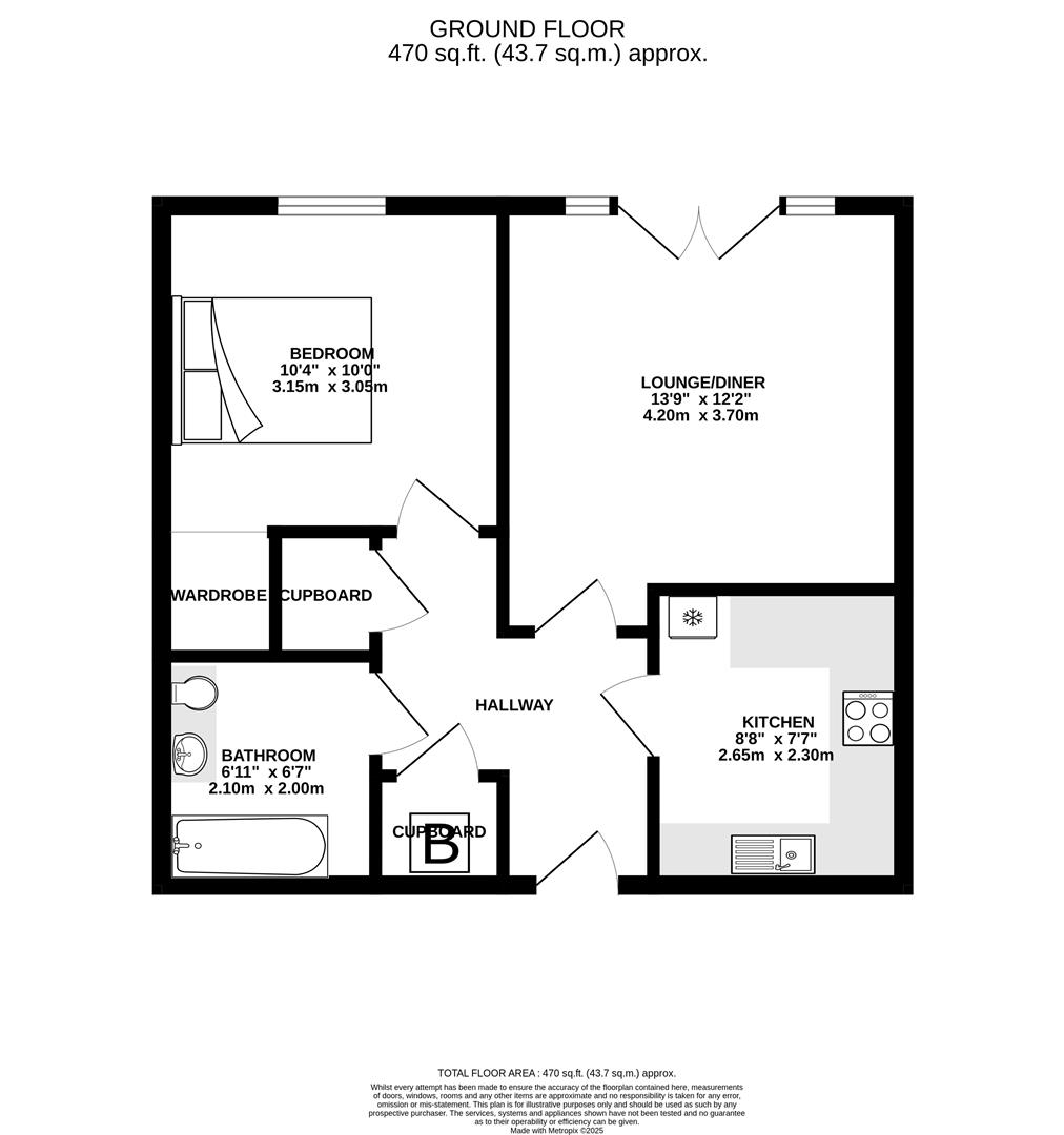 The layout briefly consists of: Spacious hallway giving access to kitchen, lounge/diner, bedroom, bathroom, and two large storage cupboards, one of which houses the boiler.