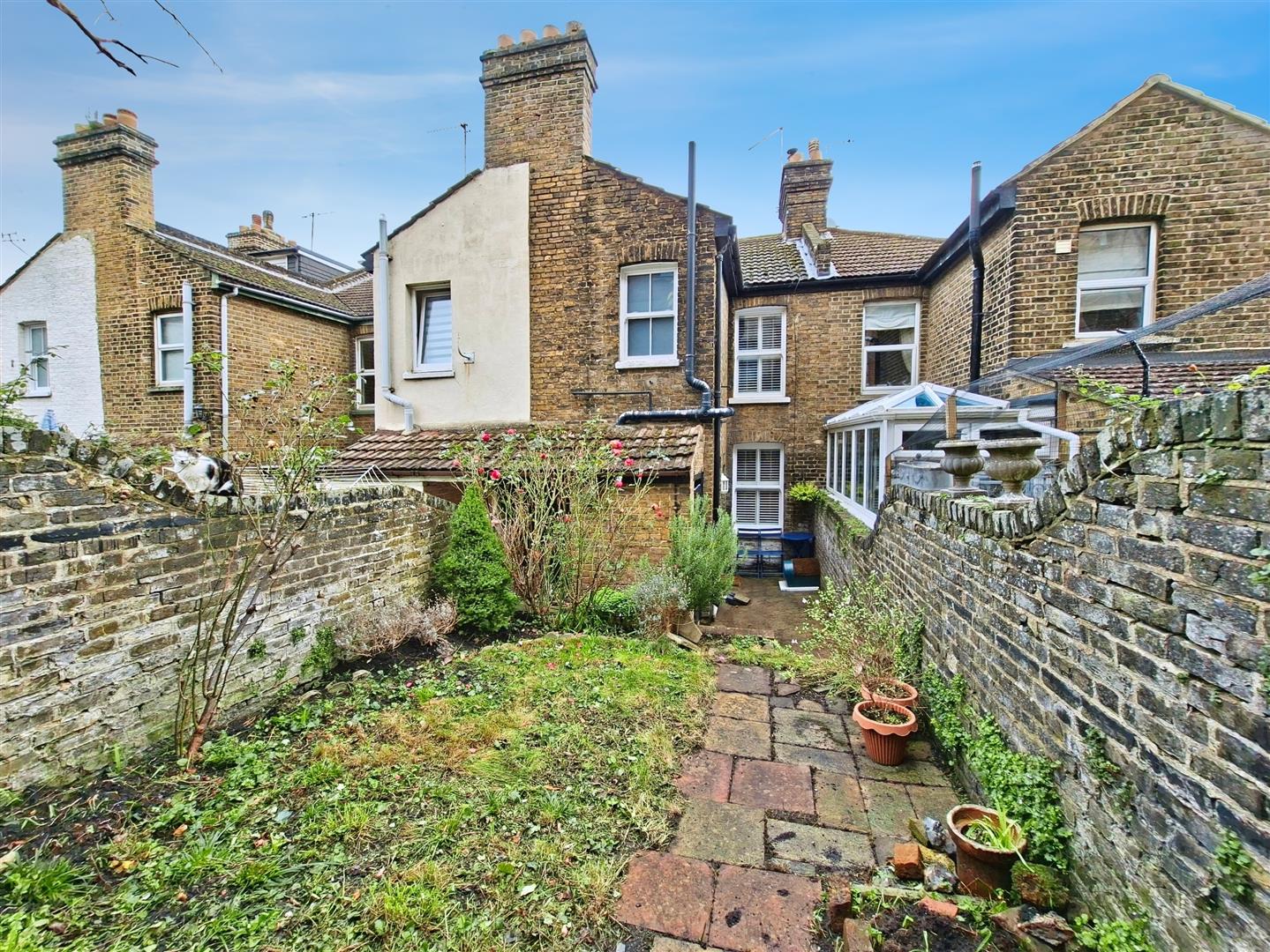 Compact kitchen to rear of property with doorway out to garden and recently new sash window to side, good range of white kitchen cupboards to wall and floor with contrasting worktops and partial neutral splashback tiles, grey tiled flooring, neutral decor, gas hob and integrated fridge. Potential to extend out to the rear outbuilding as others have done in the road, to perhaps create a bigger kitchen, or even incorporate a downstairs WC, all subject to usual permissions and new owners wishes.